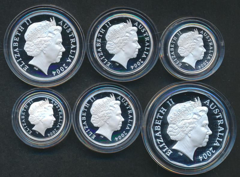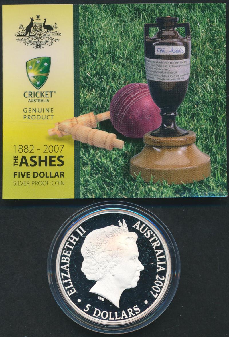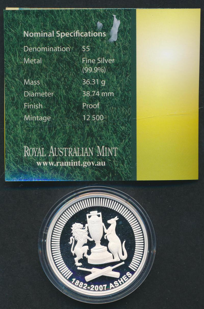 (a little aged); 2004 Fine Silver Proof Year Set (no cardboard outer); and 2007 silver $5 (36.31g 0.999) The Ashes Proof cased with cert (no outer); and 1997 $5 Bradman PNC; (4 items, 11 coins) (Image1) (Image2)