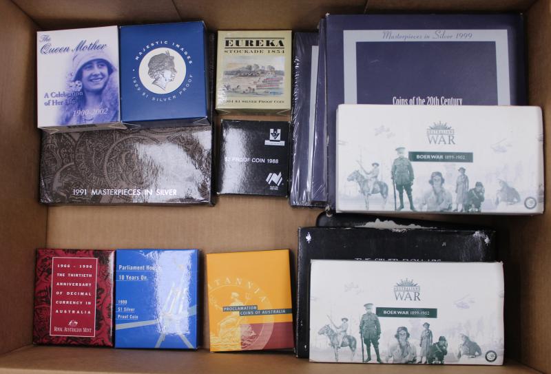 Dollar & Dump; 1992 1oz Kookaburra; 2003 Australians at War (2oz+1oz) Boer war* x2; Subscription Coins with 2003 Dollar & Dump, Sydney Mint Pattern*, 2006 Pillar Dollar; various 1oz cased singles (7); and 1988 $2 & 2004 $1 silver Proofs; total asw