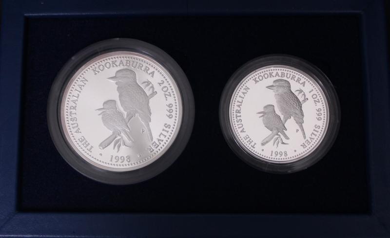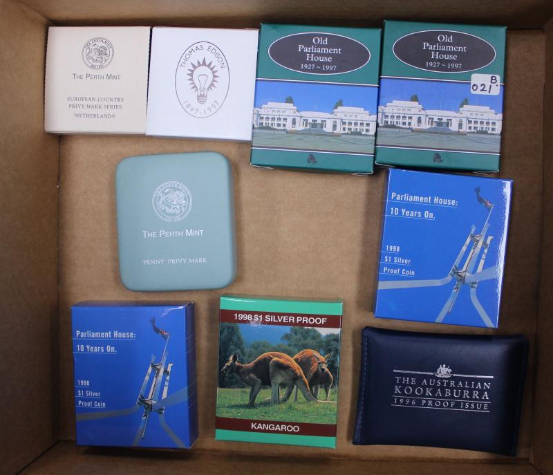 Parliament house (2), 1998 Parliament House (2); 1998 Kangaroo Proof; 2oz Kookaburra Privymarks with 'Penny' (2), 'Florin', & 'Ducat'; plus 1997 Perth Coin Fair 2oz Kookaburra+2oz Medallion set; and 1998 2oz+1oz Kookaburra Proof set; all with