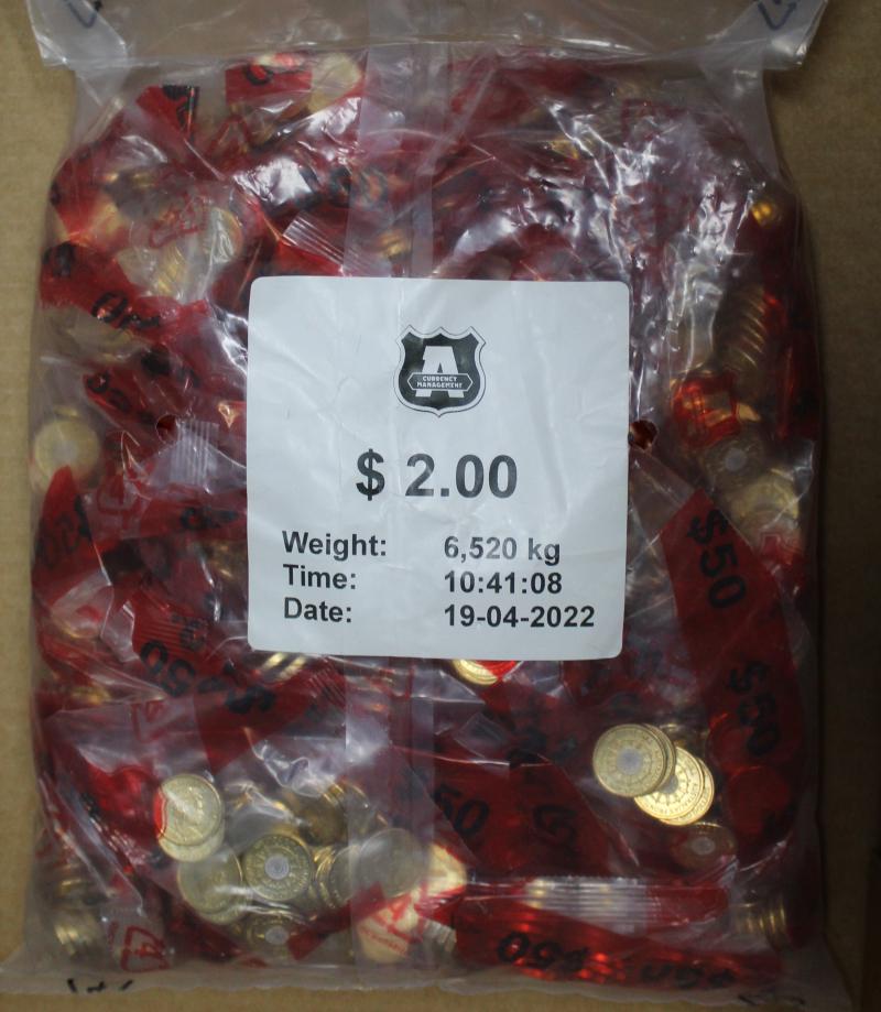 2022 $2 Frontline Workers coloured Armaguard time/date/weight label on bag of 25 coins x40, Unc, Cat $10,000. Weighs 7kg.