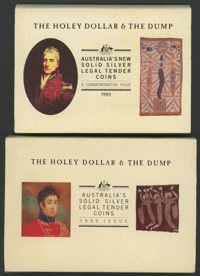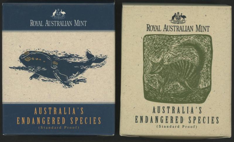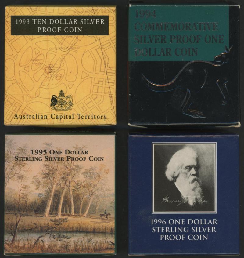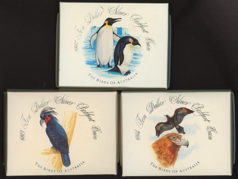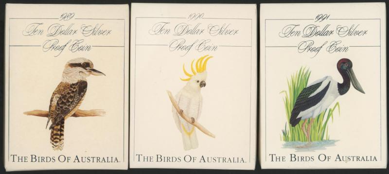 Series, Birds of Australia, Endangered Species, etc, Piedfort (40g 0.925) Birds (5), and 1995 Endangered Species; $1 Proofs (11.49g 0.925) x6; $1+25c (1¼oz) 1988 & 1990 Holey Dollar & Dump, total asw 0.977kg, packaging condition variable.