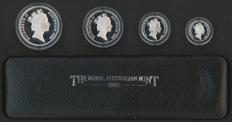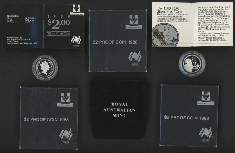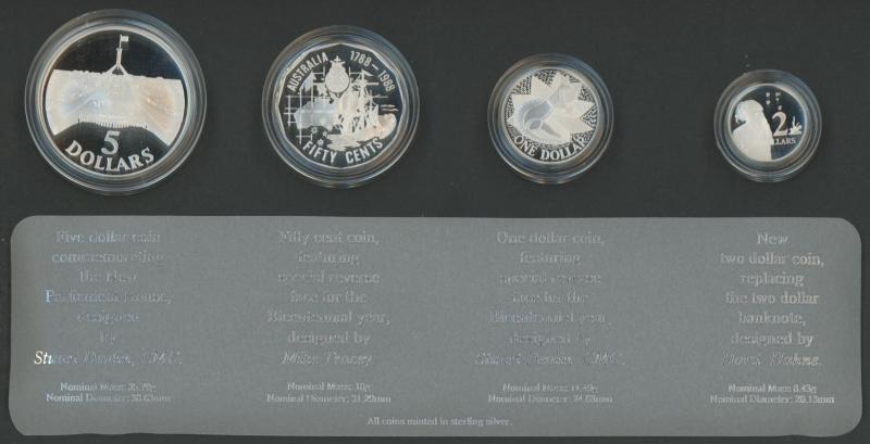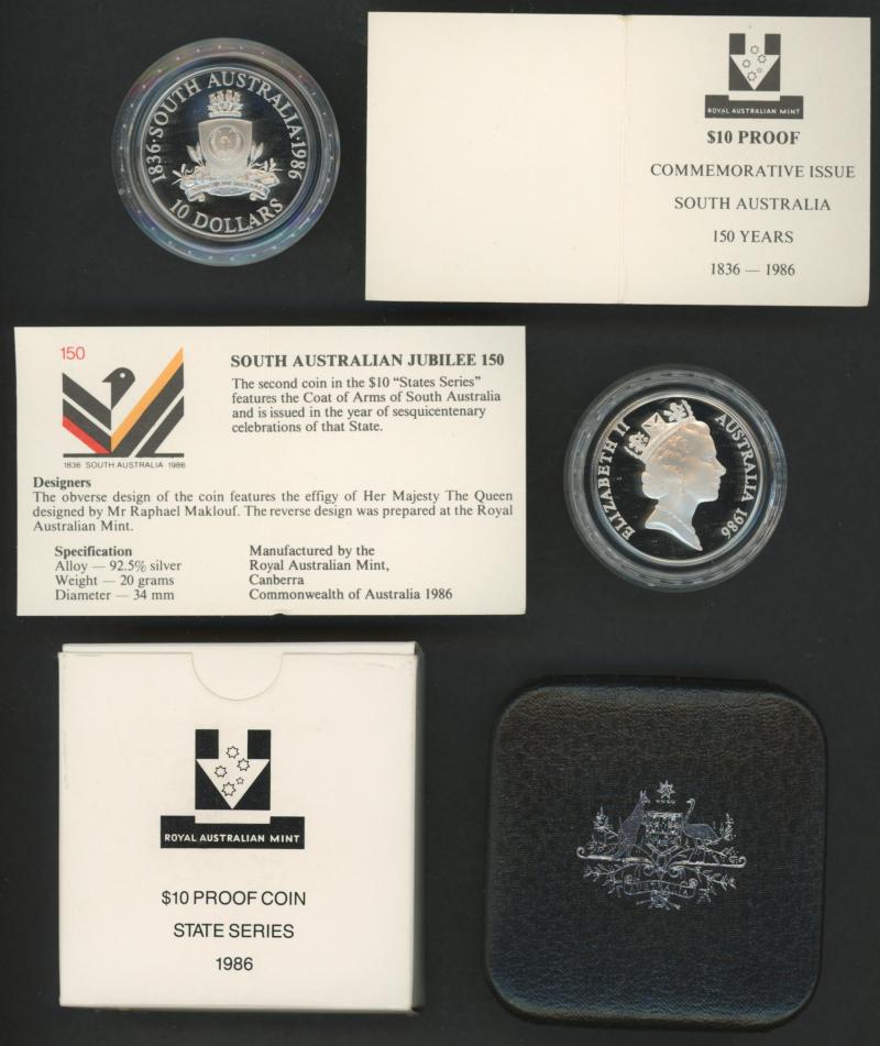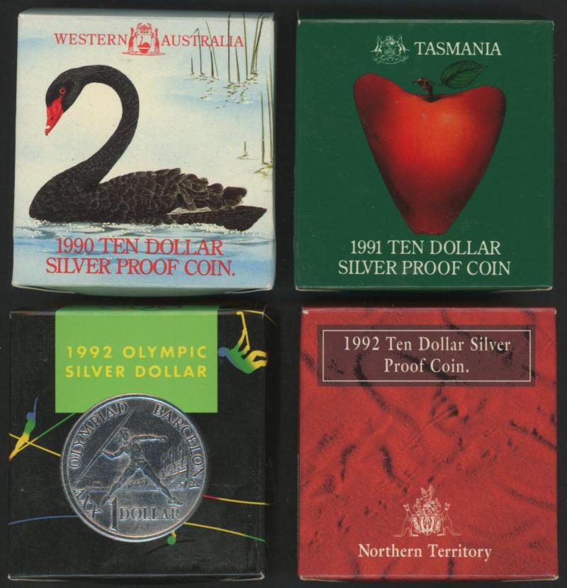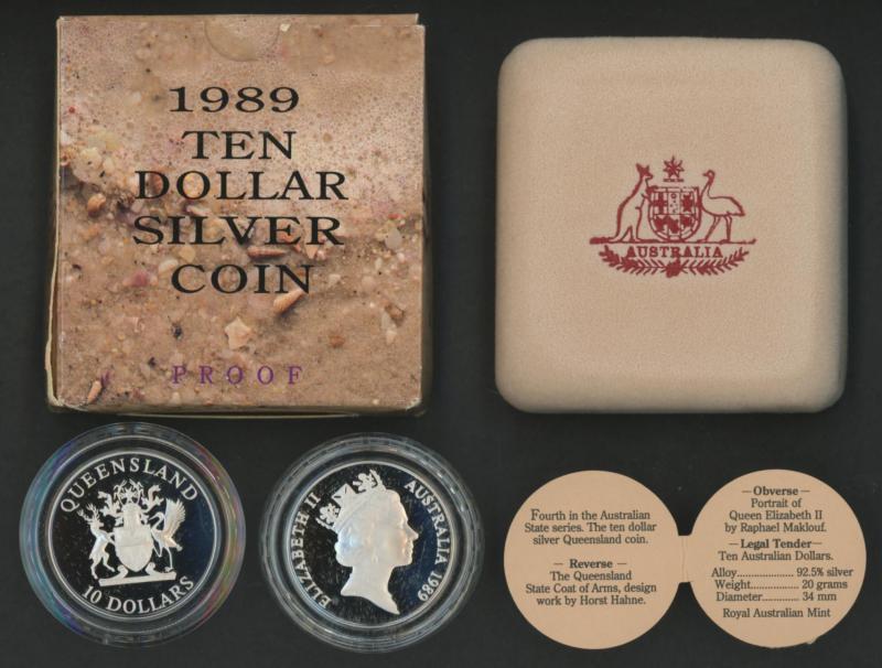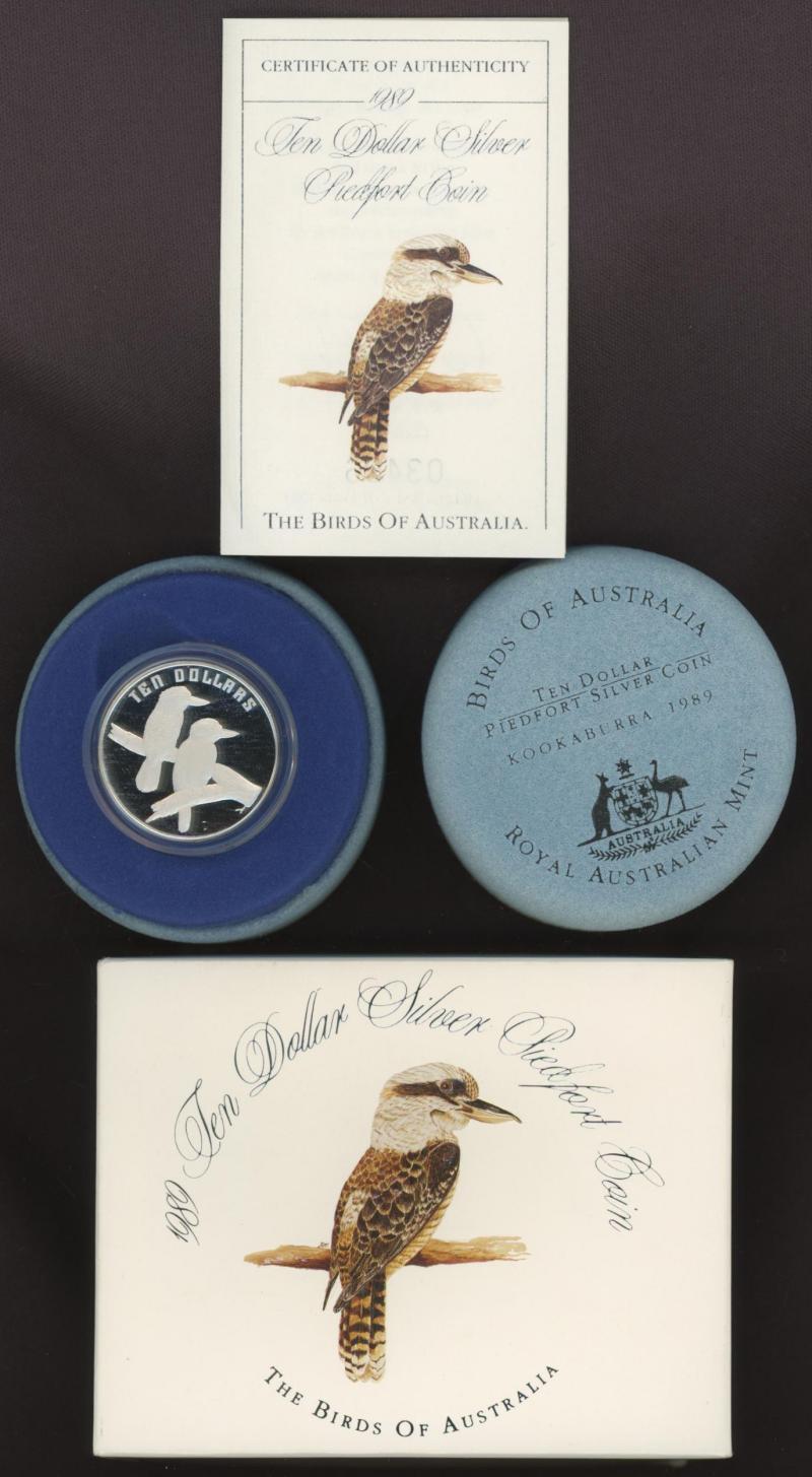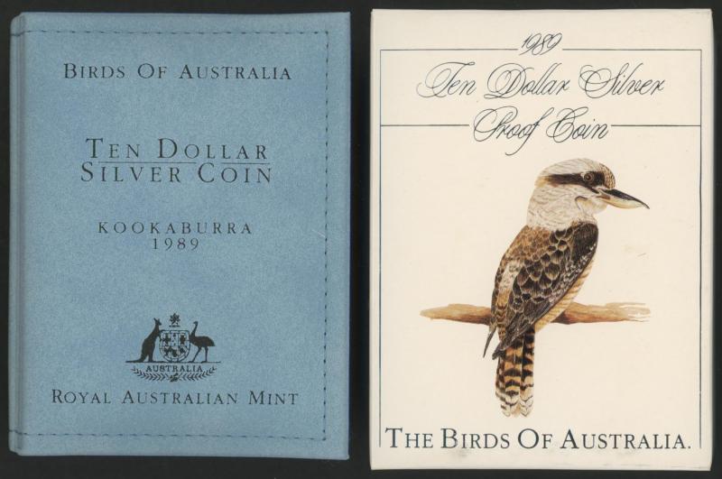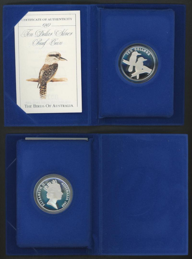 Box containing $10 (20g 0.925) 1986 SA x3, 1989 Qld x5, 1989 Birds Kookaburra x8, and Piedfort (40g 0.925) x4, 1988 $2 silver
