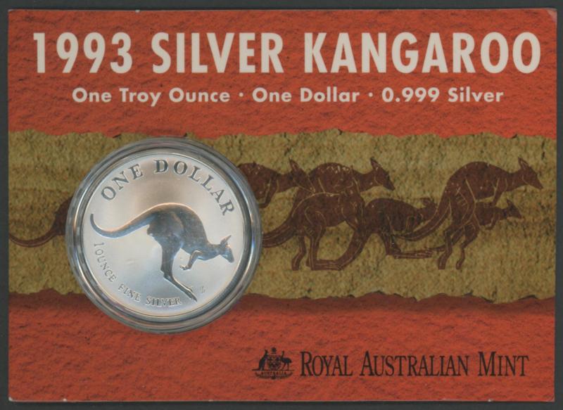 Box containing 1oz (.999) Kookaburra's x6, 1993 Kangaroo, & 30th Anniversary of Decimal Currency; $10 (20g 0.925) including State