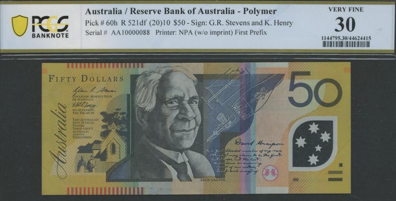 2010 $50 Stevens/Henry R509b Low Number First Prefix serial 'AA10 000088', in PCGS holder graded 'Very Fine 30'. (Image1) (Image2)