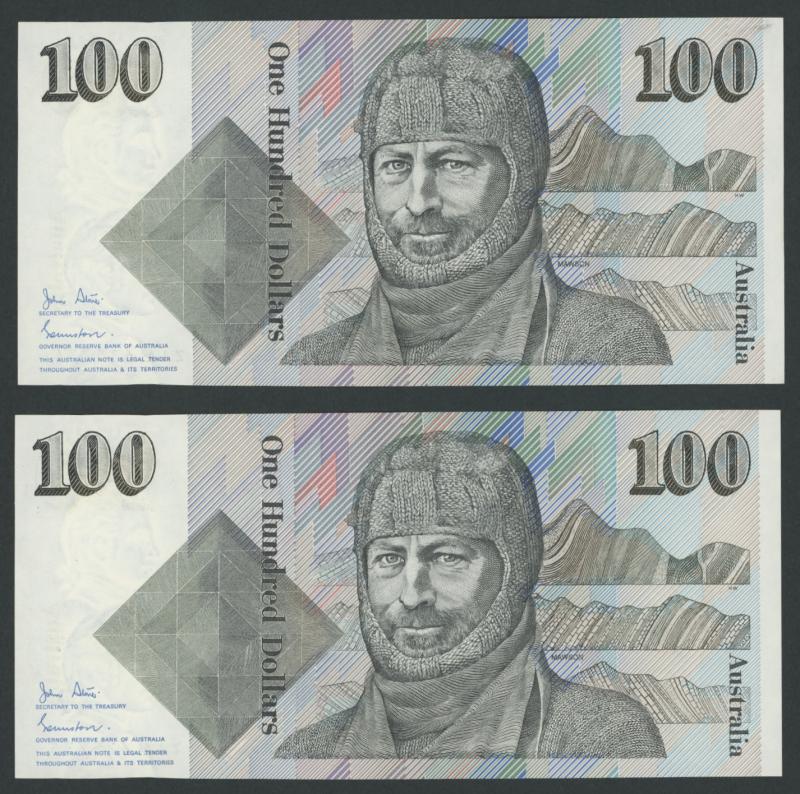 1984 $100 Johnston/Stone R608F pair First Prefix serials 'ZAA 675734'-'735', lightest bend on one unit, Unc, Cat $1540.