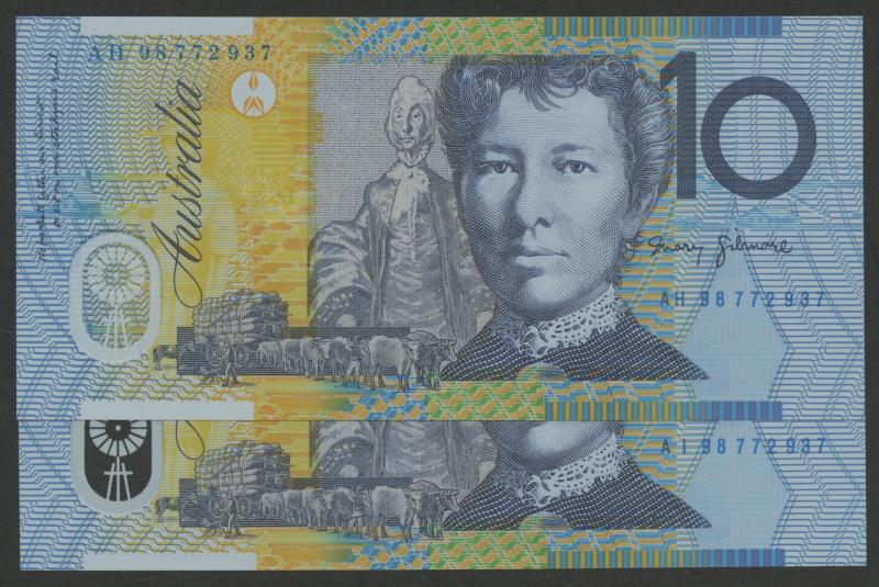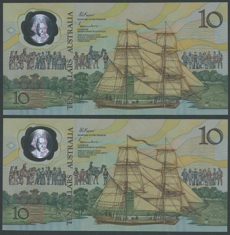 strong Printers Off-Set both sides; 1994 R316b pair (Cat $400); 1998 Macfarlane/Evans R318c with Same Serial pairs x2 (from 'Blue & Grey Tenners' folders); Cat $1110+.
