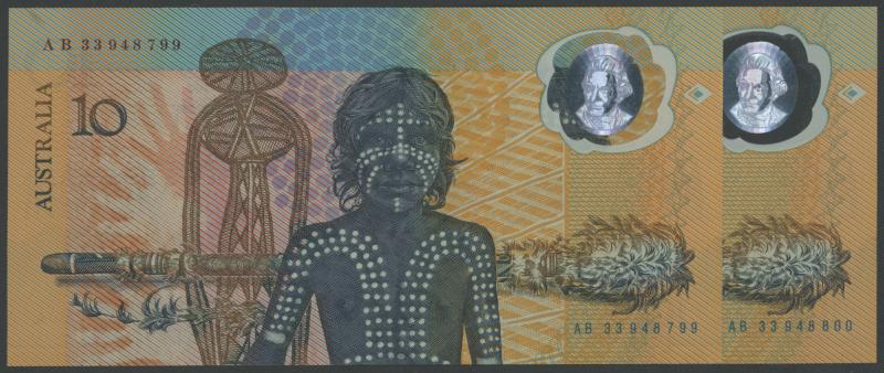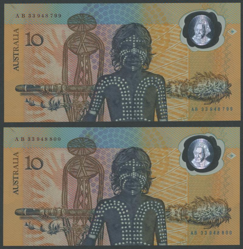 1988 $10 Johnston/Fraser Bicentenary 1st Issue R310aL Last Prefix consecutive pair 'AB33 948799'-'800', Uncirculated, Cat $4,500.
