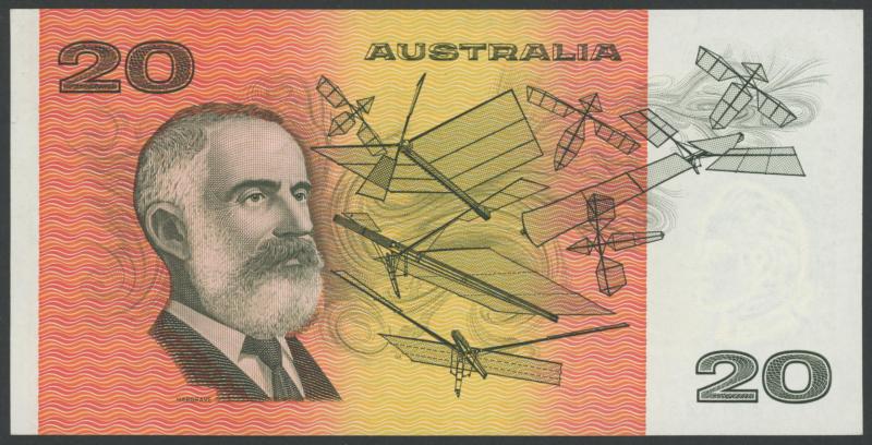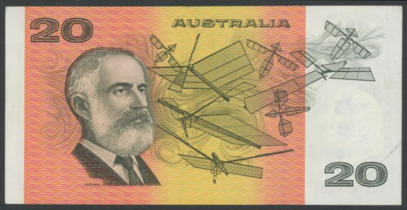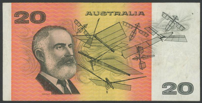 above left serial and Lawrence Hargrave's aerofoil box-kite designs on obverse, Uncirculated. An unusual error. (Image1) (Image2)