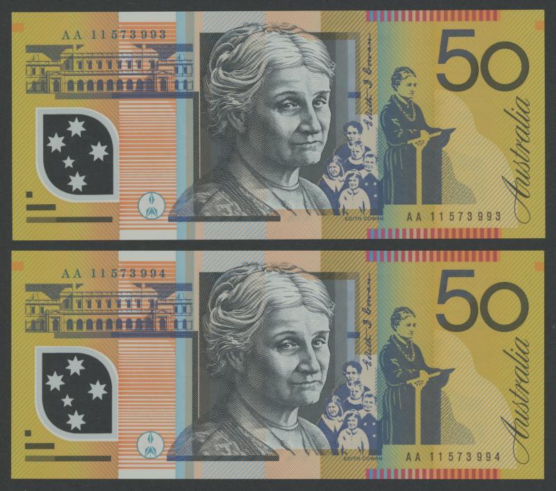 2011 $50 Stevens/Henry R521eF First Prefix pair serials 'AA11 573993'-'994'; and R521eL Last Prefix pair serials 'JC11