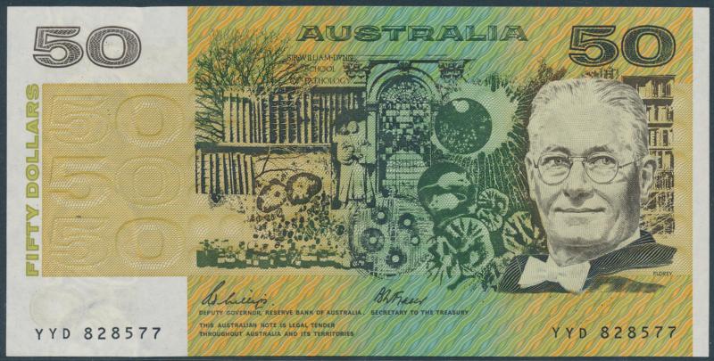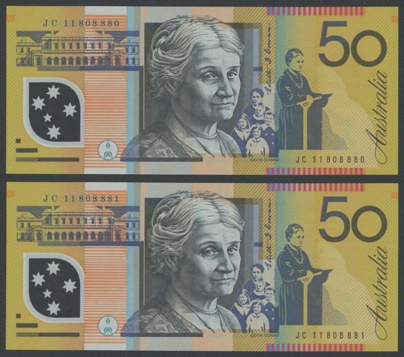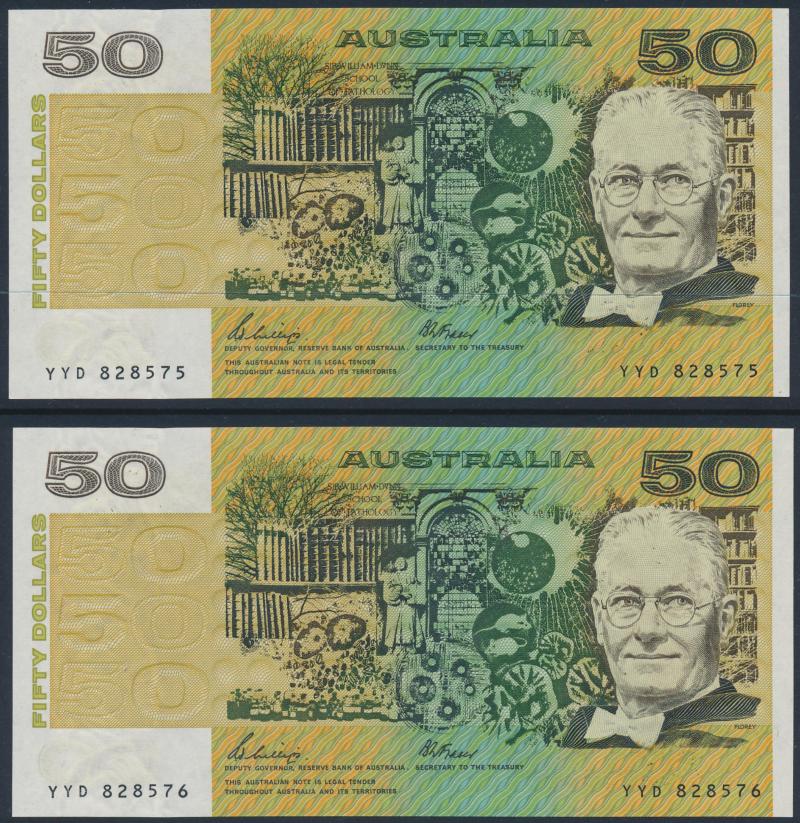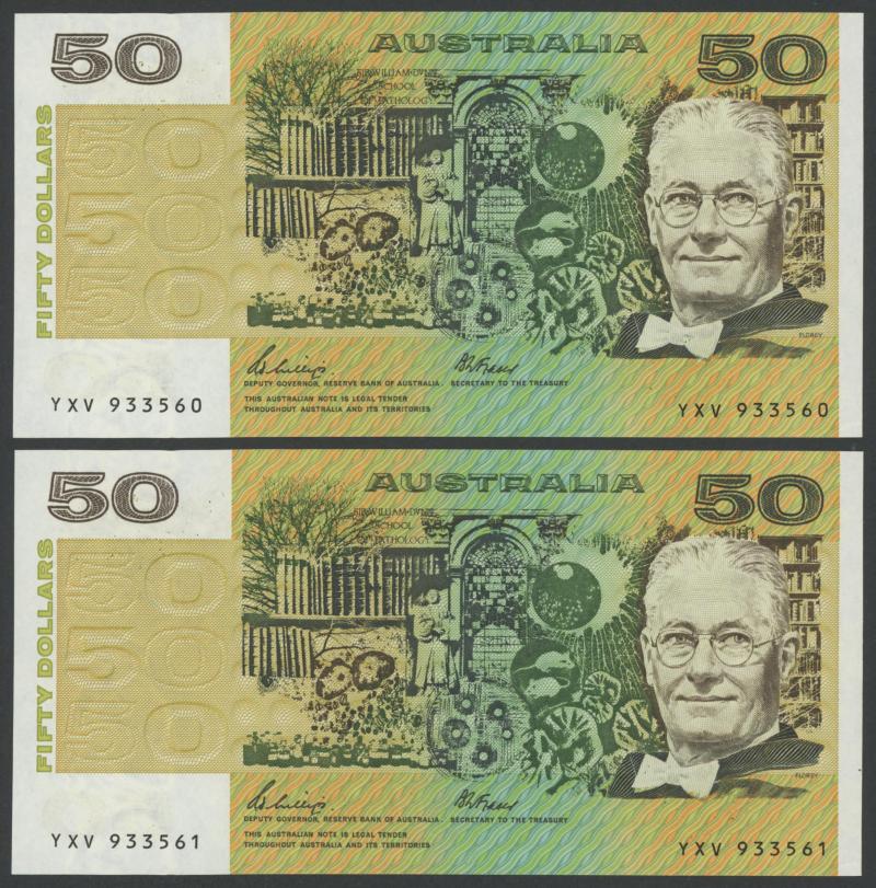 1989 $50 Phillips/Fraser R511 consecutive pair serials 'YXV 933560'-'561', Uncirculated, Cat $450.