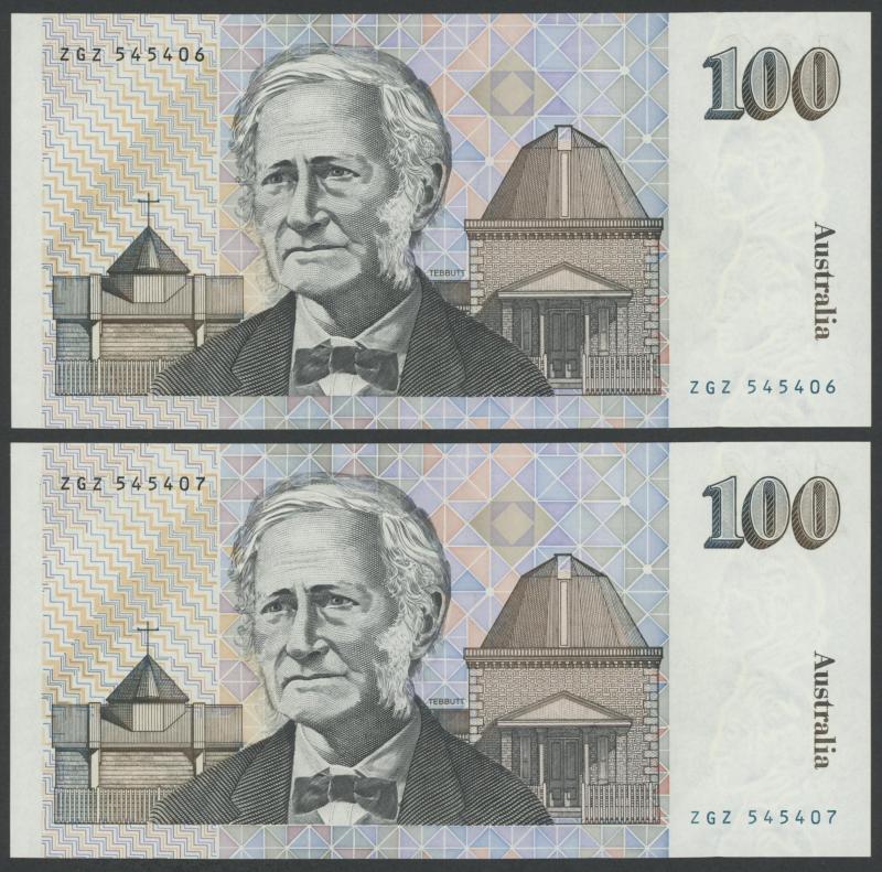 2011 $100 Fraser/Higgins R612 pair serials 'ZGZ 545406'-'407', Uncirculated, Cat $700. (Image1)