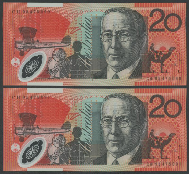 1995 $20 Fraser/Evans R416b consecutive run of four serials 'CH95 475088'-'091', Uncirculated, Cat $1200.