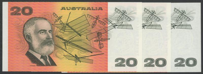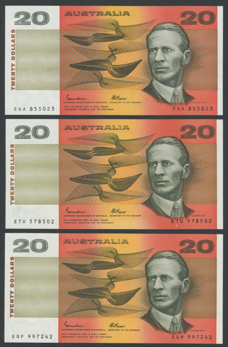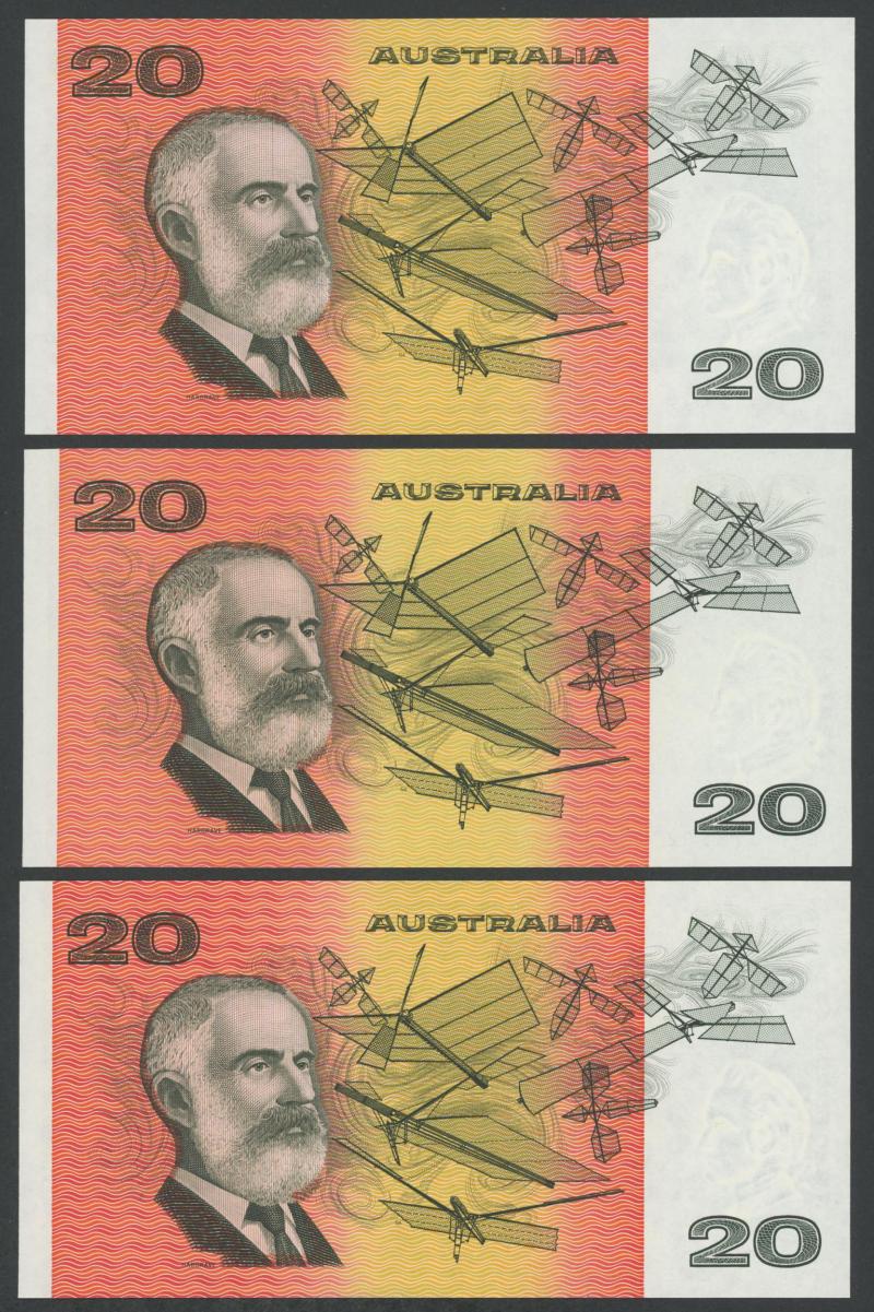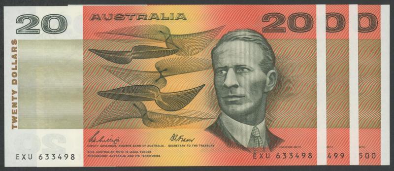 1989 $20 Phillips/Fraser R411 run of three serials 'EXU 633498'-'500', Uncirculated, Cat $540. (Image1) (Image2)