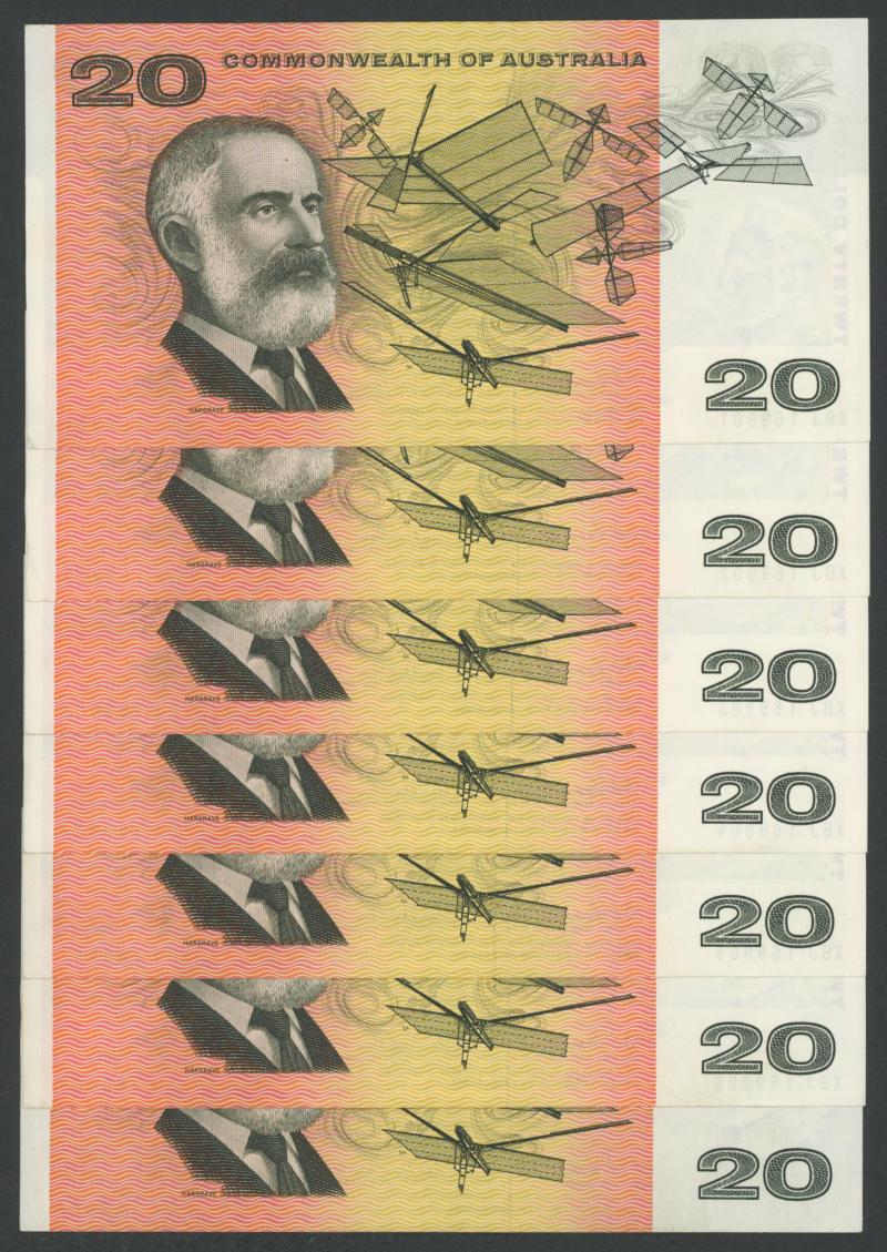 1966 $20 Coombs/Wilson R401 consecutive run of seven serials 'XBJ 169901'-'907', pay packet bends, light teller bends, EF.