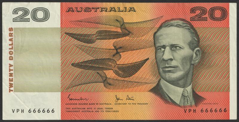 1983 $20 Johnston/Stone R408 Solid Serial 'VPH 666666', centre bend, light folds, aEF. (Image1) (Image2)
