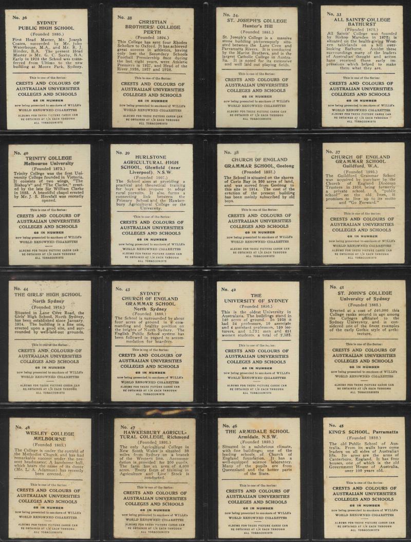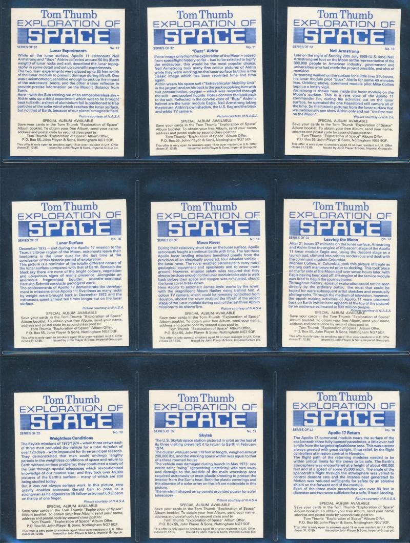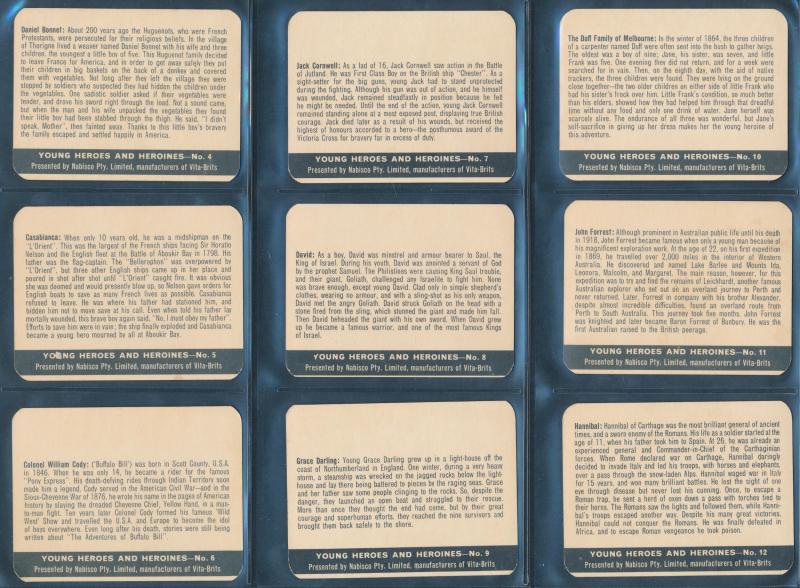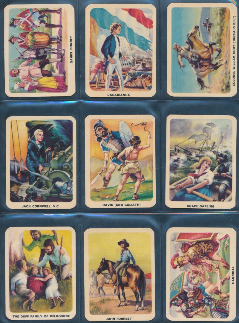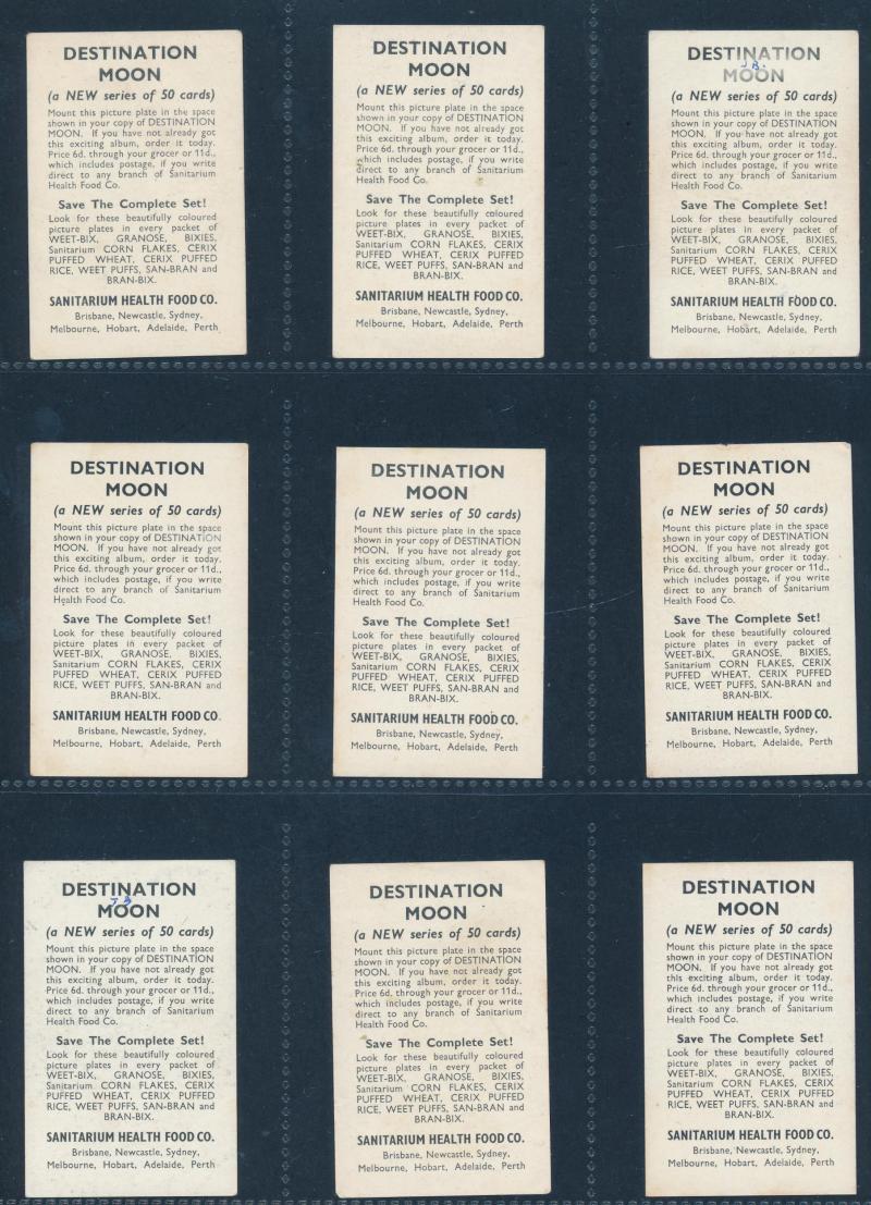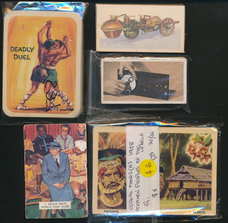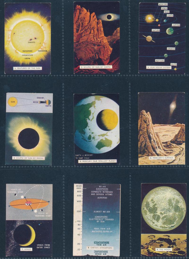 [25/25], John Player & Sons ‘ Tom Thumb Exploration of Space’ [32/32], Cadet Sweets, Tip Top ‘ [24/25], Nabisco ‘Young Heroes and Heroines’ [30/30], Sanitarium Health Food Co ‘Destination Moon’ [50/50], Teofani & Co Ltd, and more. Mainly fair/fine.