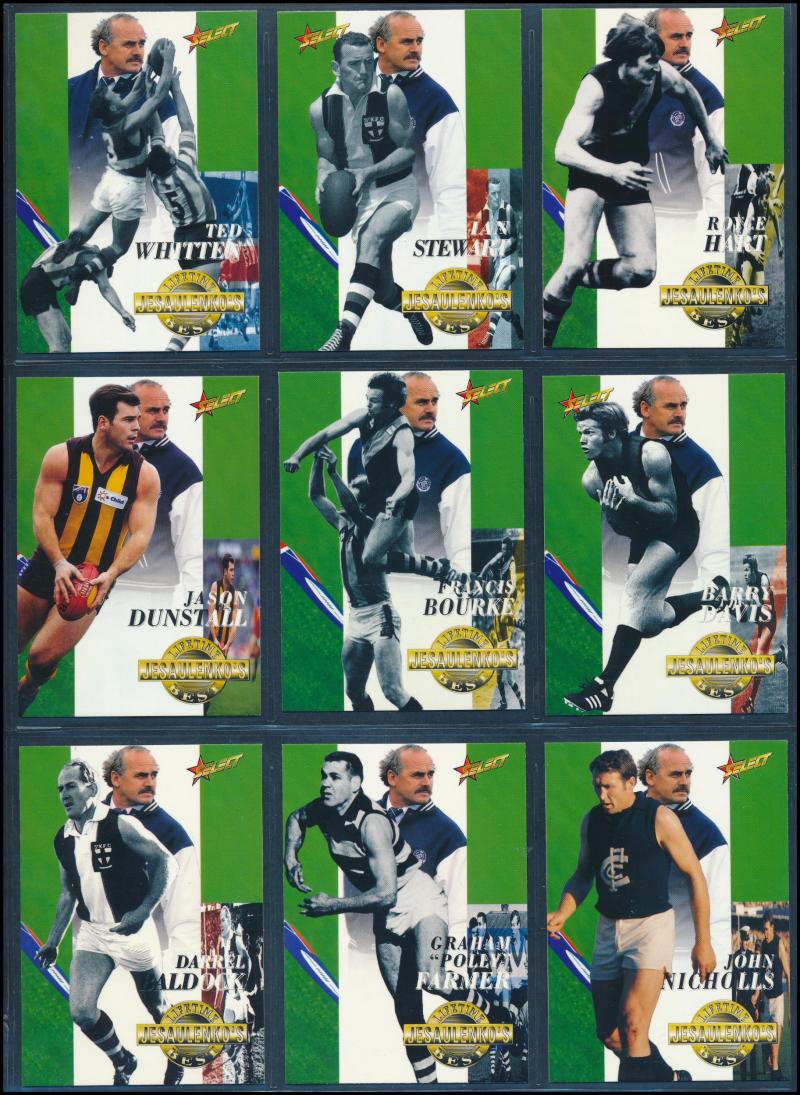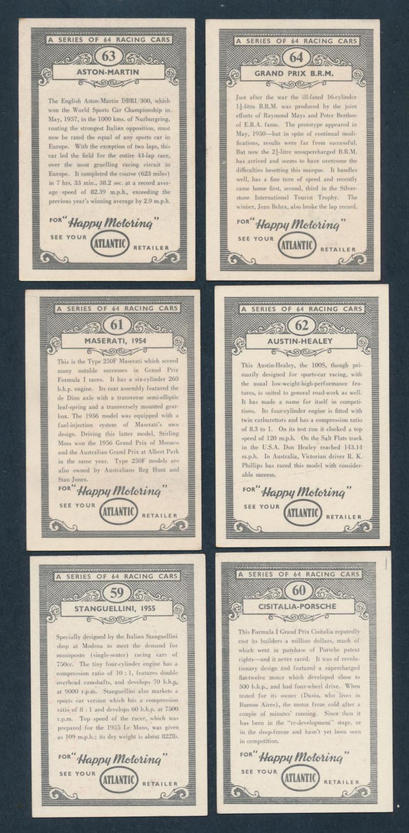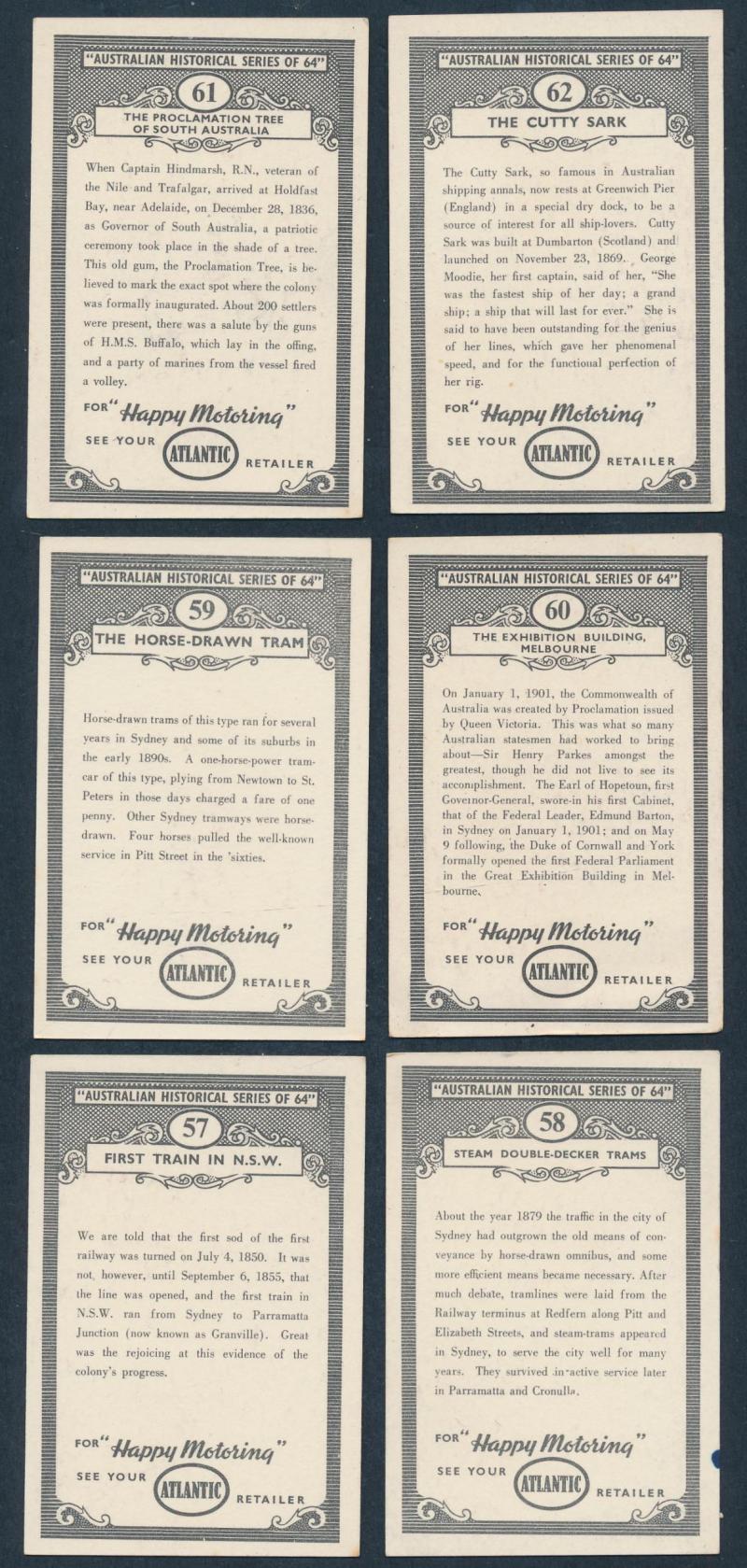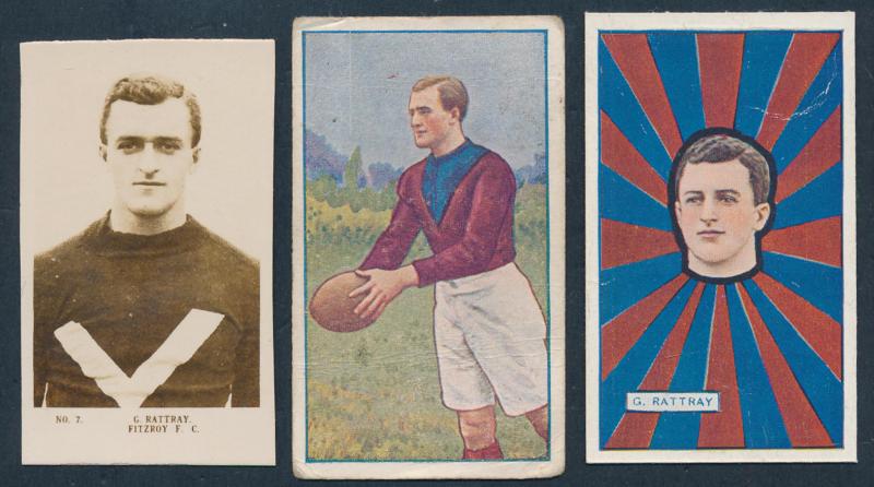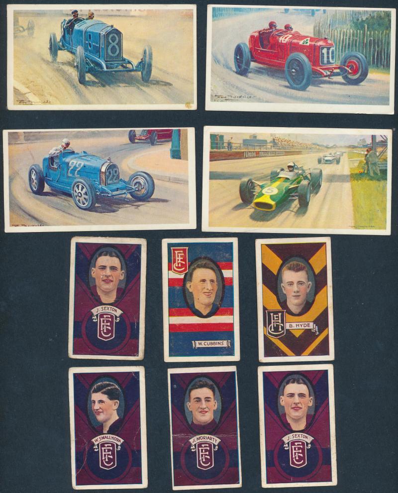 1920s JJ Schuh football cards (3); 1950s Atlantic 'Racing Cars' [64] & 'Australian Historical' [64]; also folk-art badge of Brighton footballer, mainly Fine.