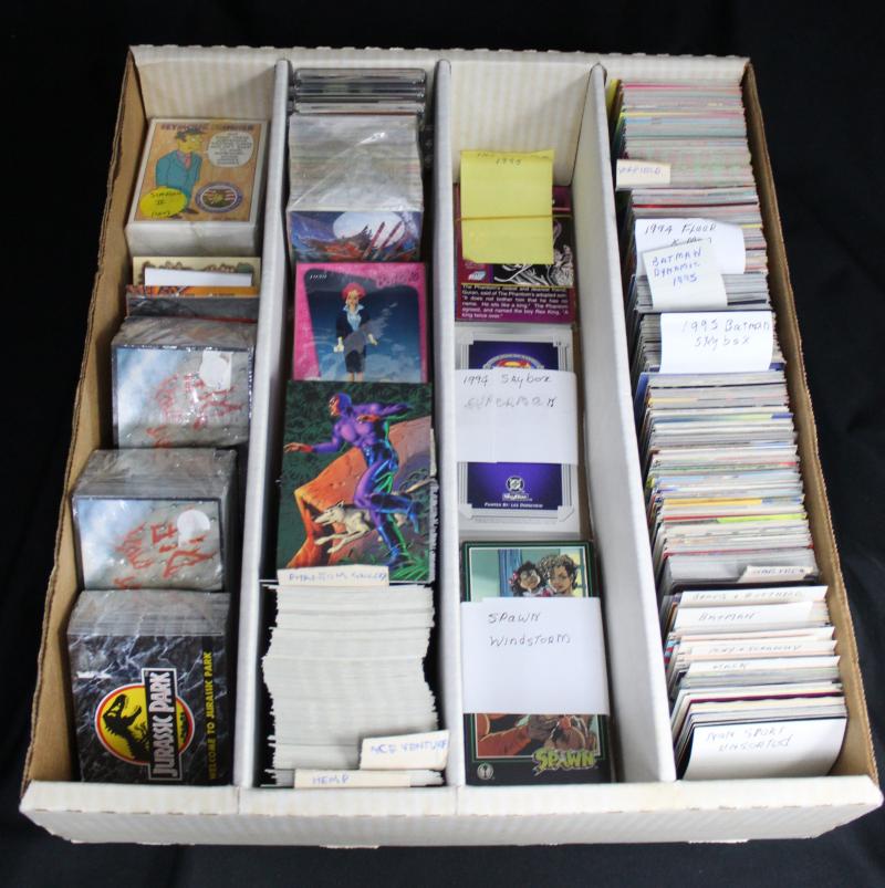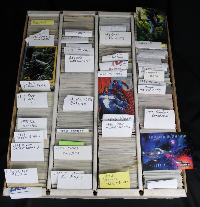 Collection 1990s cards including Batman, Star Trek, Garfield, Phantom, Ace Ventura, Aladdin, Coca-Cola, The Beatles, Jurassic Park,