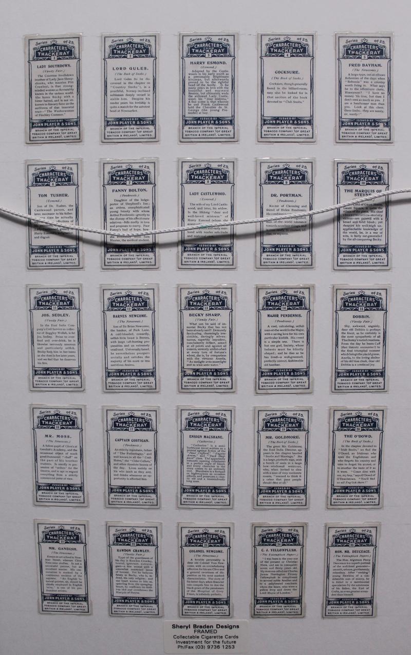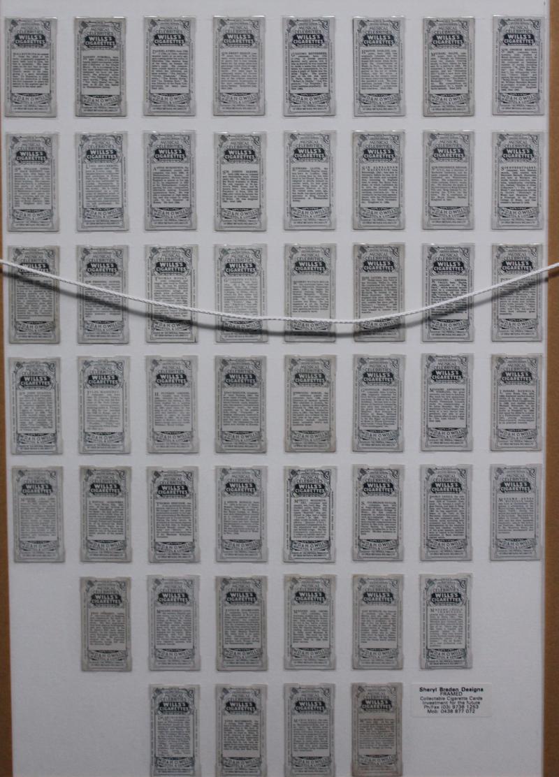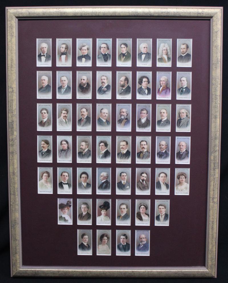 Collection including framed sets 1914 Wills 'Musical Celebrities, 2nd Series' [50] & 1913 Players 'Characters of Thackeray' [25];