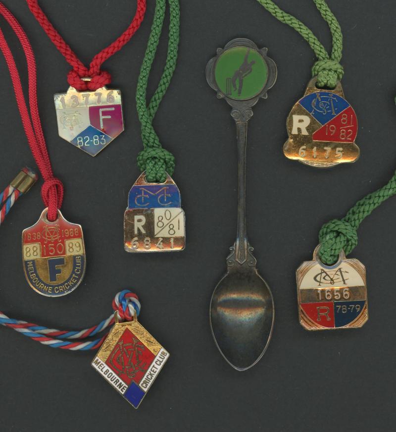 Oddments Melbourne Cricket Club membership badges (10) for 1976-77, 1978-79, 1979-80, 1980-81, 1981-82, 1982-83, 1984-85, 1988-89,