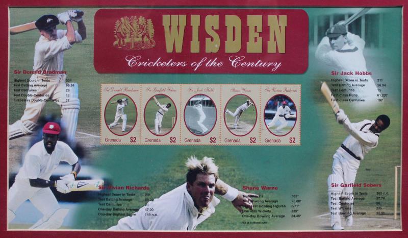 Richards & JB Hobbs (signed cricket card affixed to mini-bat), window mounted with Grenada stamps mini-sheet, framed & glazed, overall 83x49cm.