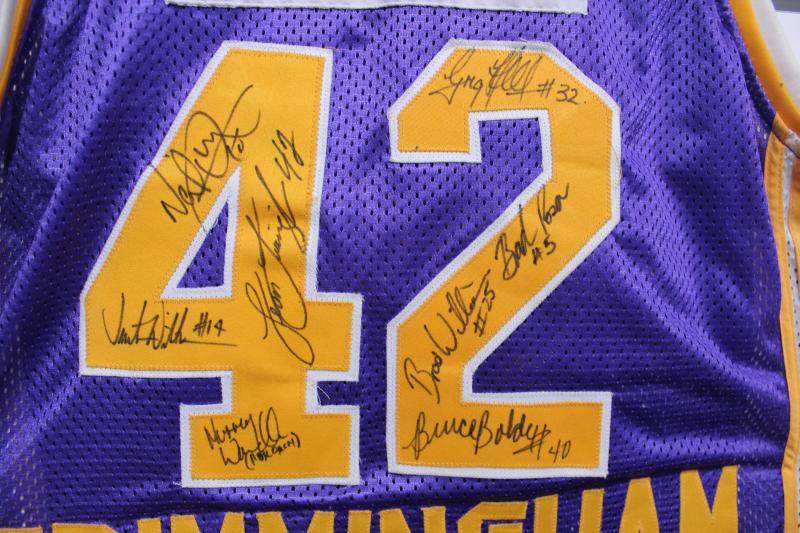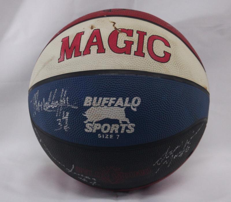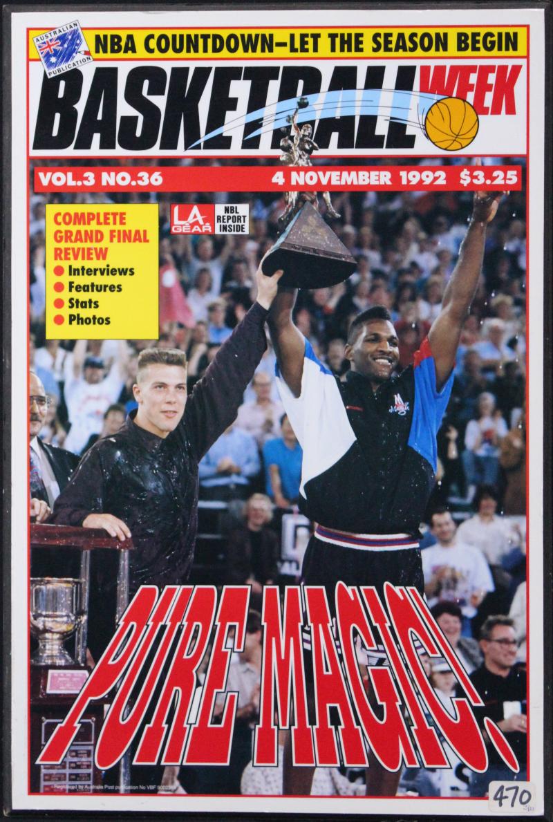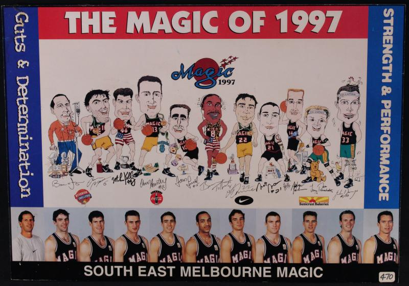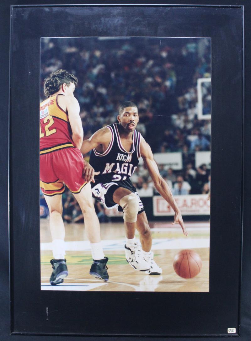 Spectres, Won by Southeast Melbourne Magic', 41cm tall; 'Magic' basketball with 12 signatures including Bruce Bolden, Andrew Parkinson & John Borge; plus range of photographs/posters (9), all framed, various sizes (some quite large).