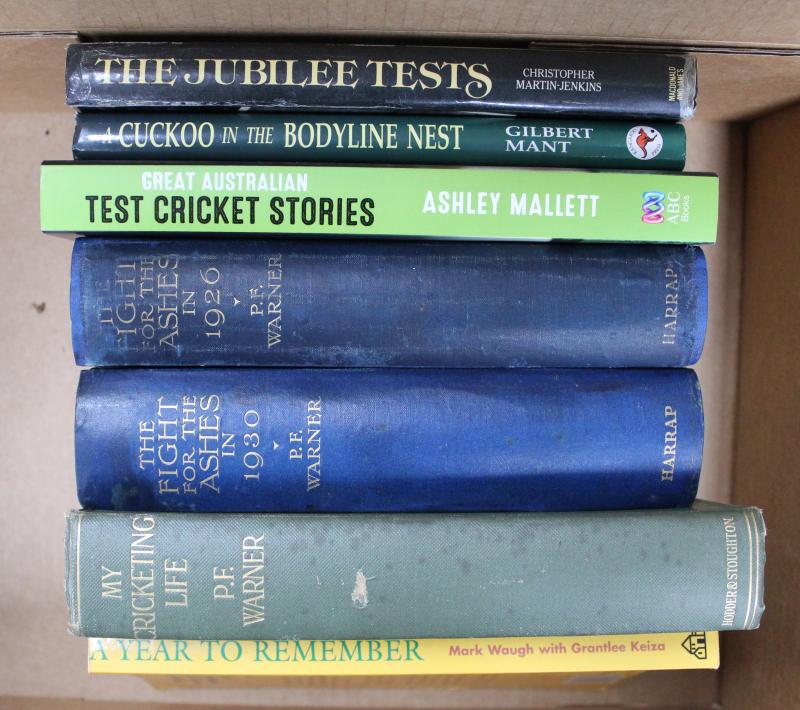 Books including 'My Cricketing Life' by PF Warner [London, 1921]; 'The Fight for the Ashes in 1926' & 'The Fight for the Ashes in