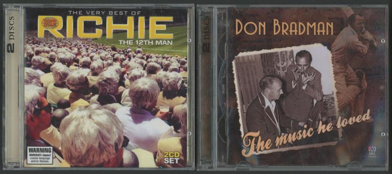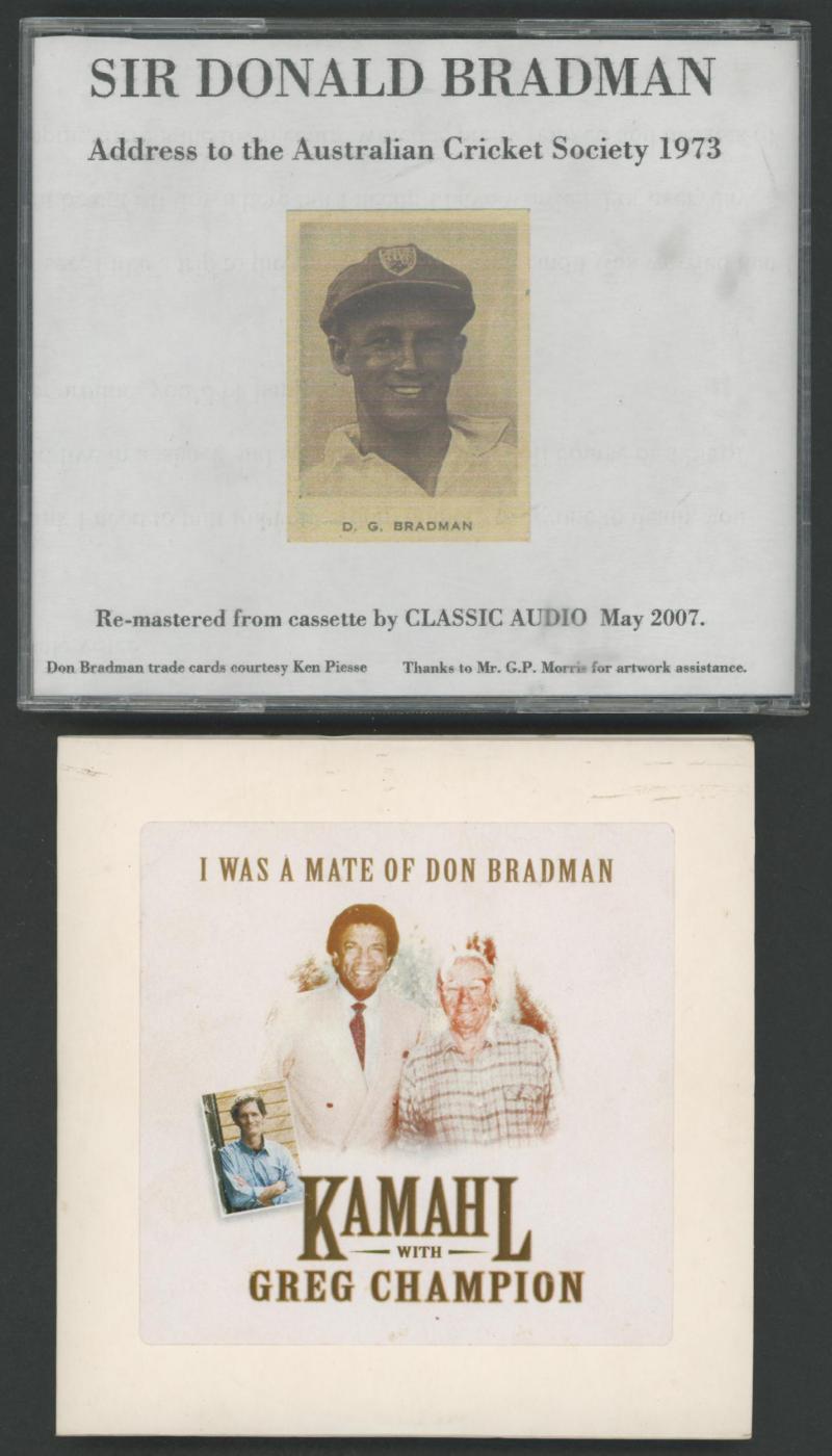 postcard; CDs (5) with 'Don Bradman - The Music He Loved', 'I Was a Mate of Don Bradman' by Kamahl & Greg Champion, 'The Very Best of Richie' by the 12th Man, Bill Woodfull's farewell address 1962 & Don Bradman's address to Aust Cricket Society 1973;