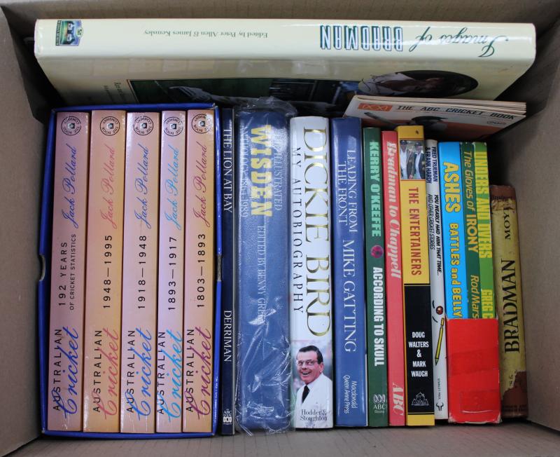 including Don Bradman, Bob Simpson & Neil Harvey; 'Australia Test Player' signed cards (19) & 1982 Ashes PSE with 8 signatures; books/magazines (16) including 'Bradman - The Illustrated Biography' with Don Bradman signature on front cover; 1982 Ashes