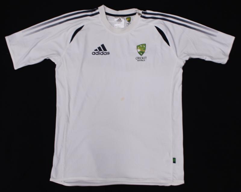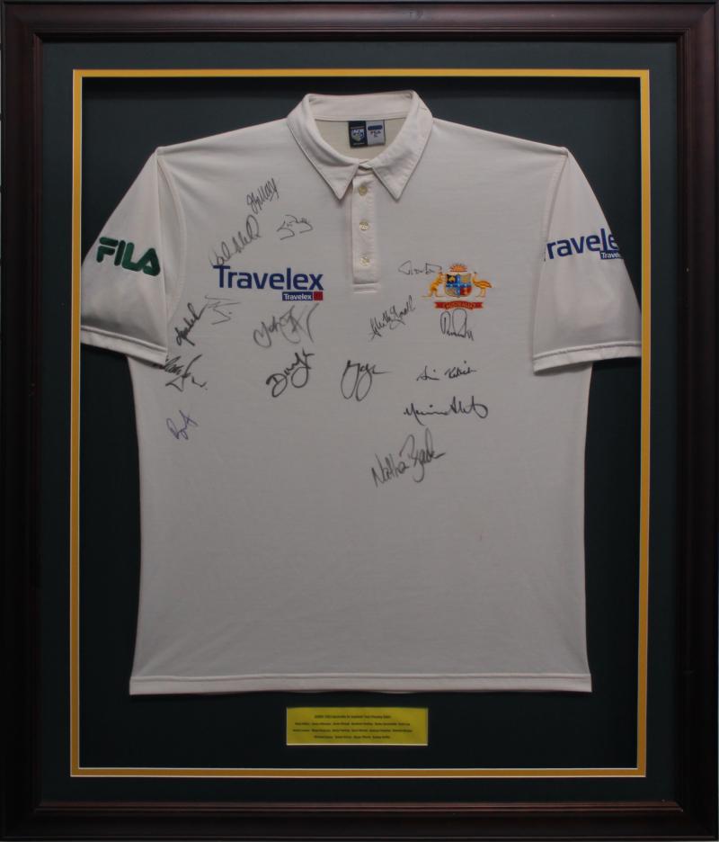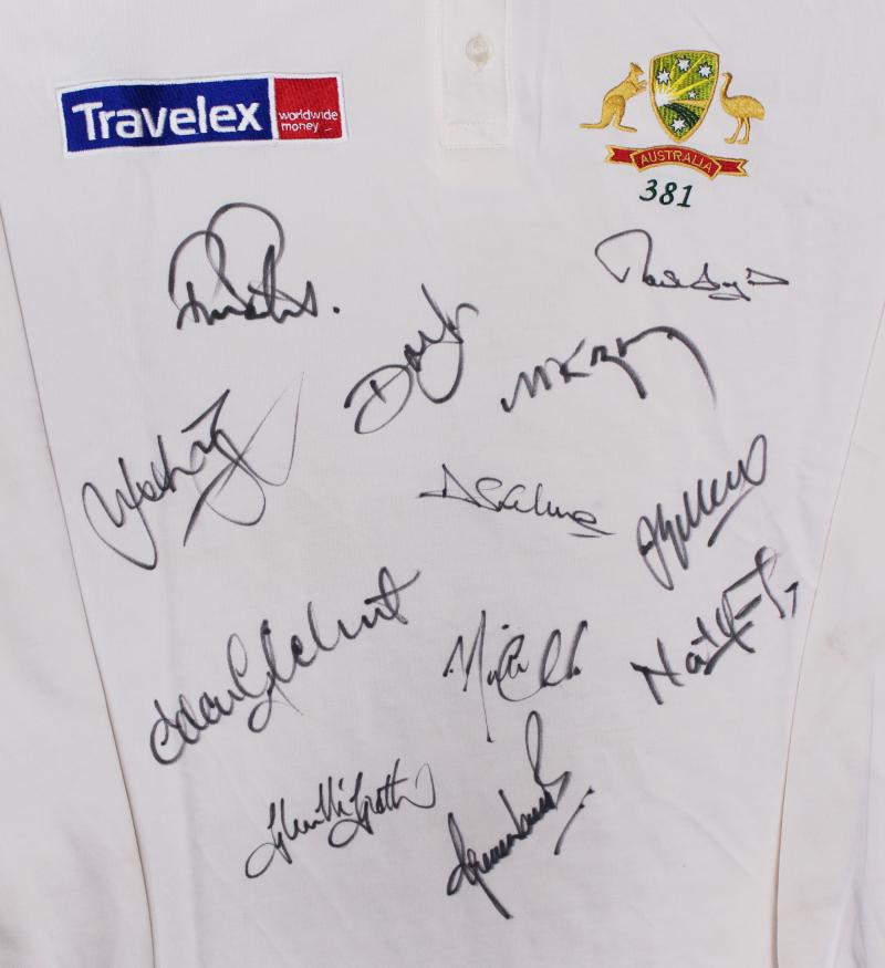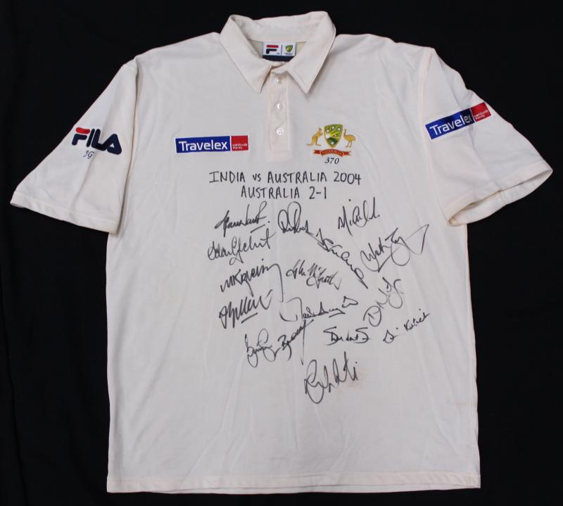 worn, circa 2004, with 12 signatures including Ricky Ponting, Adam Gilchrist, Glenn McGrath & Shane Warne, Fine match-worn condition. Ex Tim Nielsen (assistant coach) collection. (Image1) (Image2)