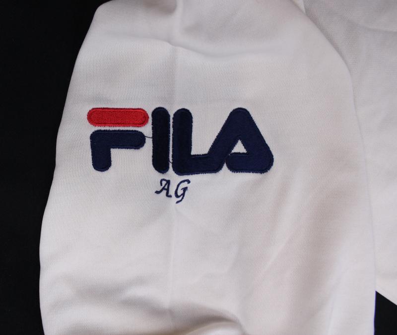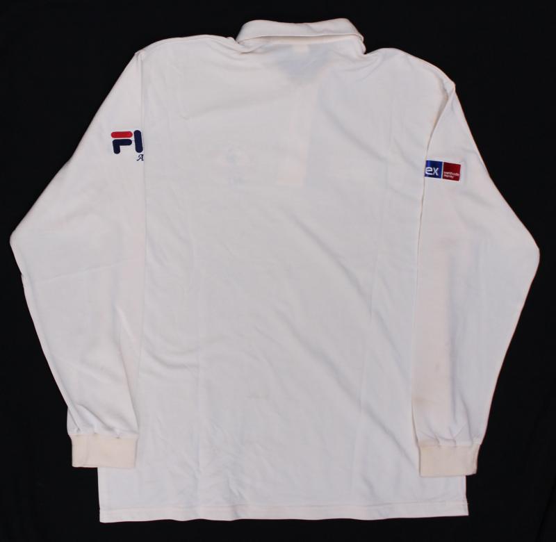 Adam Gilchrist's Australian Test Shirt with embroidered CA Coat-of-Arms, '381', and Travelex & FILA (with AG below) logos, match