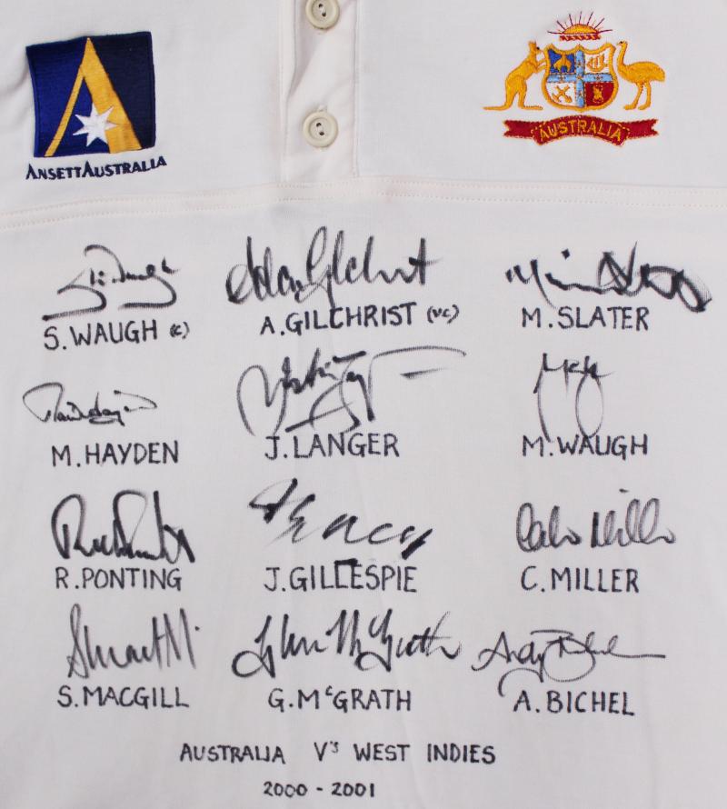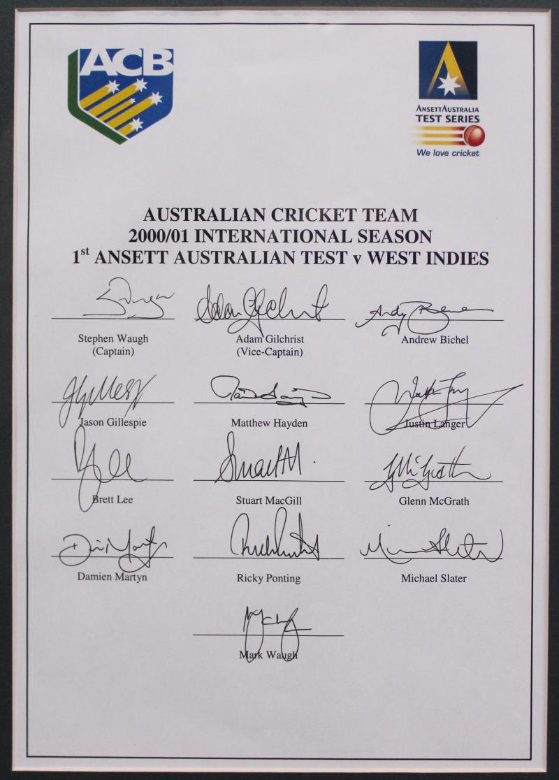 endorsed 'Australia v West Indies 2000-2001' with 12 signatures of the Australian Team including Steve Waugh, Adam Gilchrist, Colin Miller, Jason Gillespie. Ex Jason Gillespie collection. (Image1) (Image2)