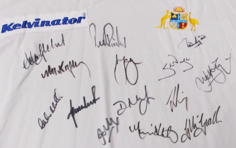 Australian Test Shirt with embroidered Australian Coat-of-Arms and Travelex & FILA logos, match worn with 16 signatures of the