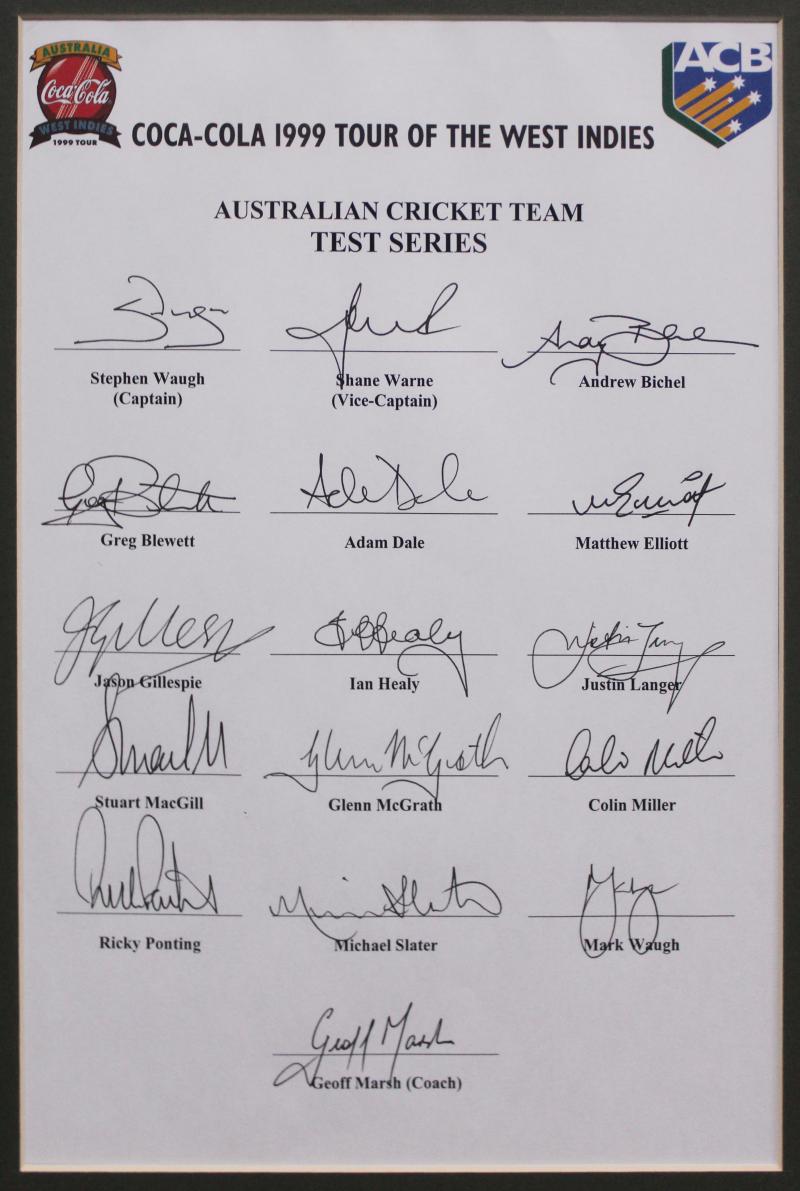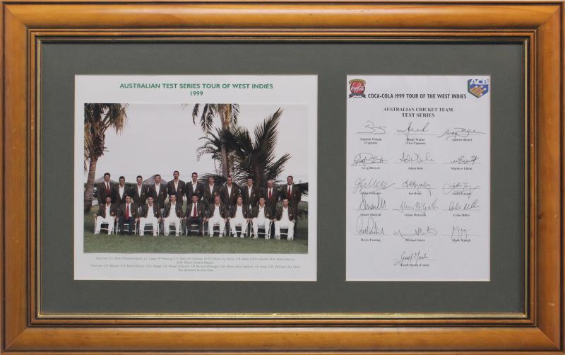 Display comprising official team sheet 1999 Australian Tour of West Indies with 16 signatures including Steve Waugh, Shane Warne &