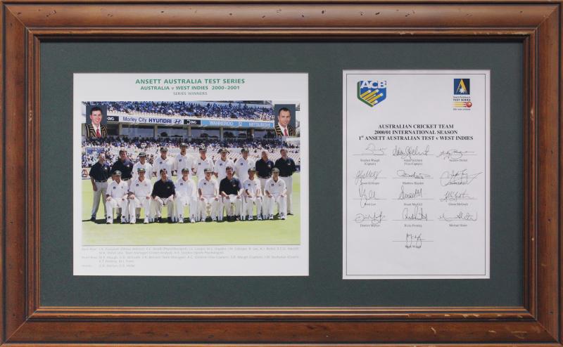 Display comprising official team sheet 2000-01 1st Test v West Indies with 13 signatures including Steve Waugh, Adam Gilchrist &