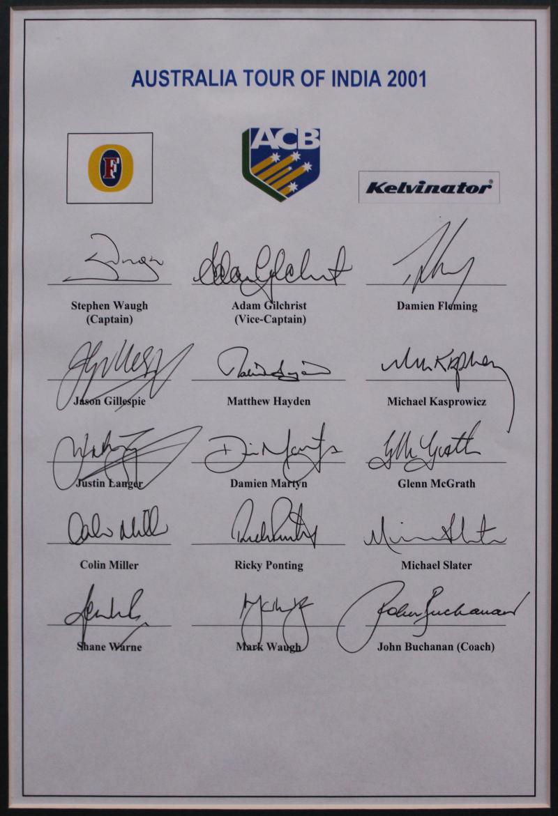 Display comprising official team sheet 2001 Australian Tour of India with 15 signatures including Steve Waugh, Matthew Hayden,