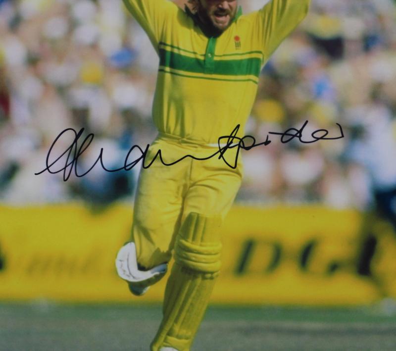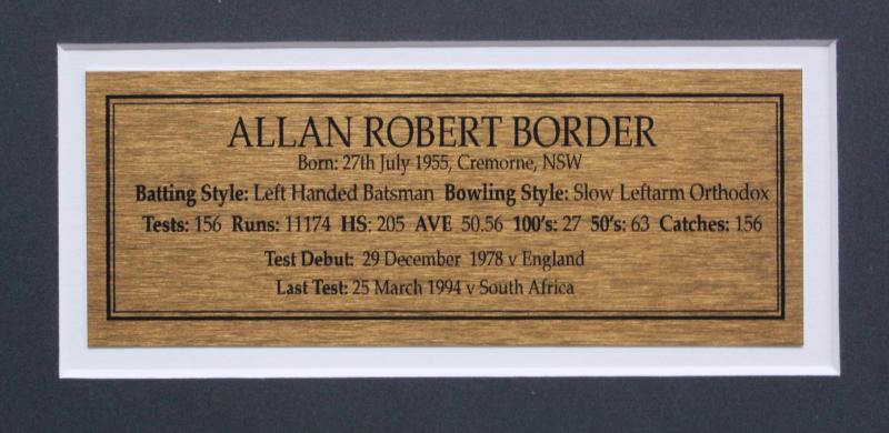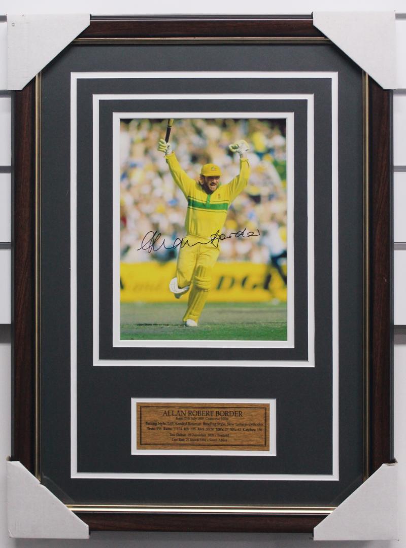 signatures including Steve Waugh, Shane Warne, Ian Healy, Darren Berry & Greg Blewett, framed & glazed, overall 78x58cm; also, Allan Border signed photograph, window mounted, framed & glazed, overall 46x67cm. Ex Jason Gillespie collection.