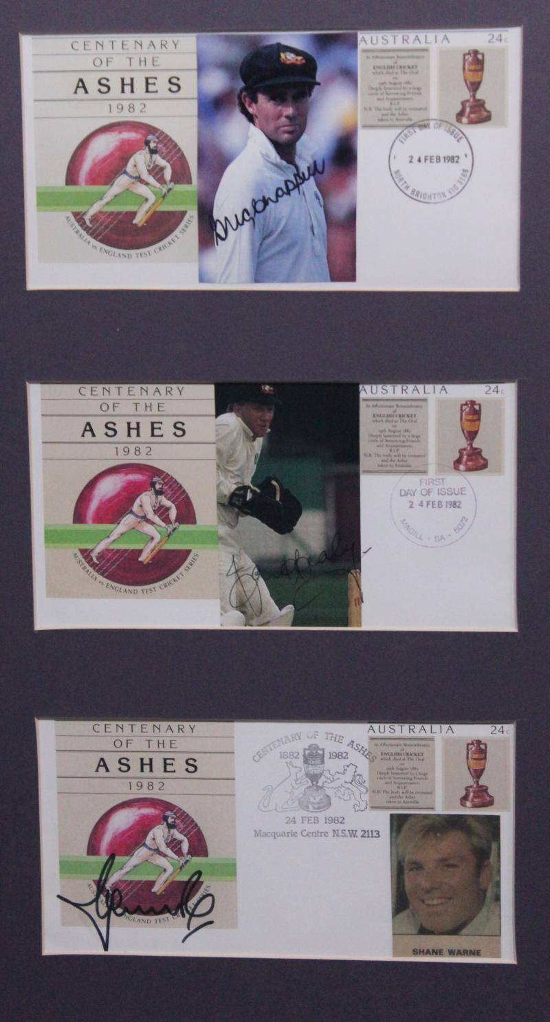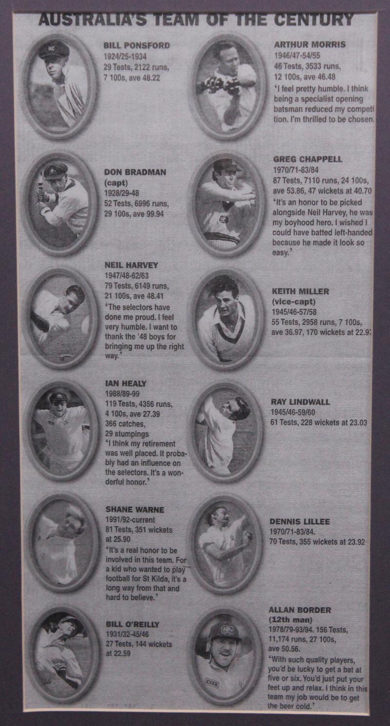 Morris, Greg Chappell, Neil Harvey, Keith Miller, Ian Healy, Ray Lindwall, Shane Warne, Dennis Lillee, Bill O'Reilly & Allan Border, window mounted, framed & glazed, overall 79x66cm. (Image1) (Image2)