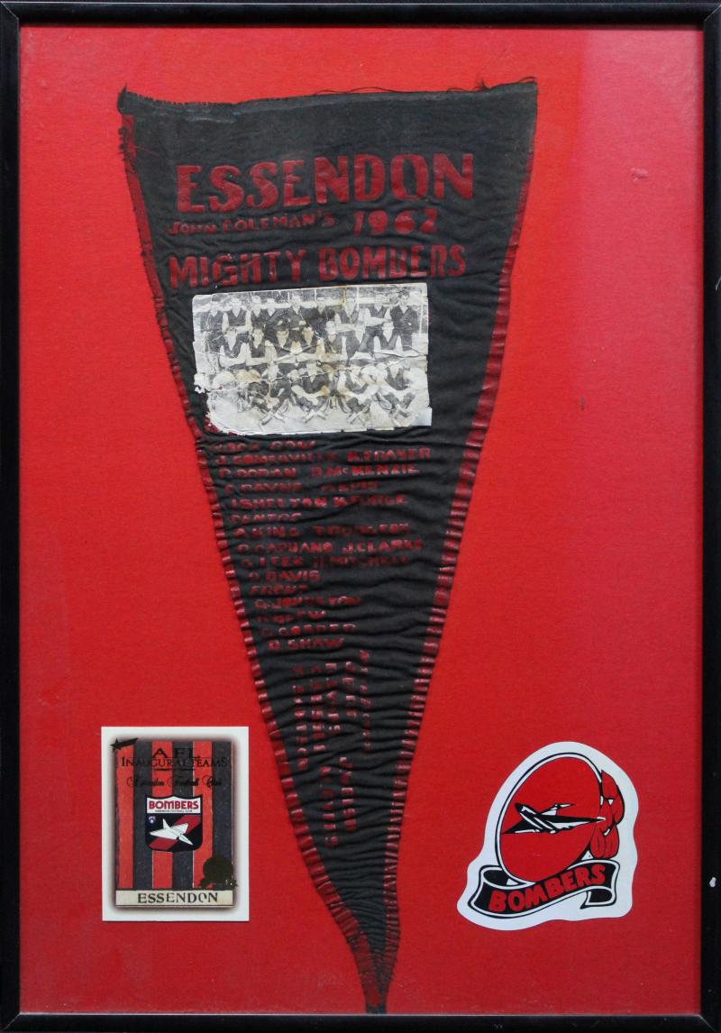 ESSENDON: Collection including pennants (5) - one signed by Dick Reynolds (faded); 1964 Heinz poster signed Jack Clarke; badges