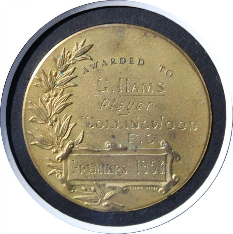 COLLINGWOOD: 1953 Premiership Medal awarded to George Hams, engraved on reverse 'Awarded To G.HAMS, Player, COLLINGWOOD F.C.,