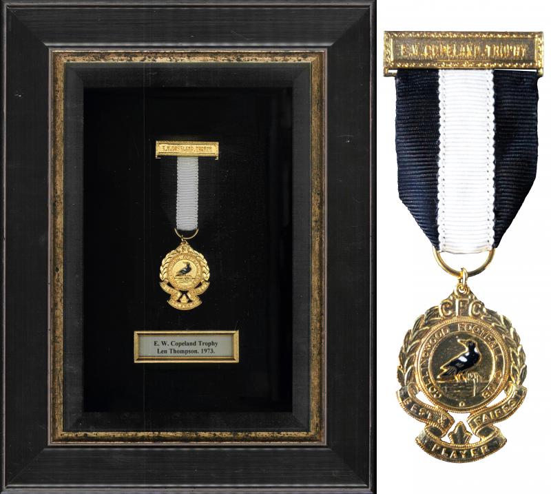 COLLINGWOOD: 1973 Copeland Trophy awarded to Len Thomson, with 'E.W.COPELAND TROPHY' on bar, black & white ribbon, medal with