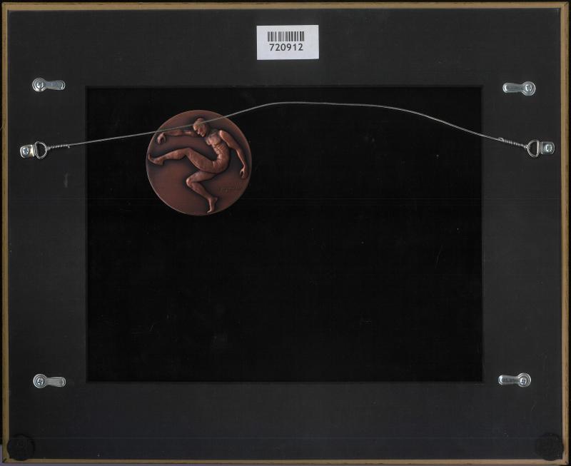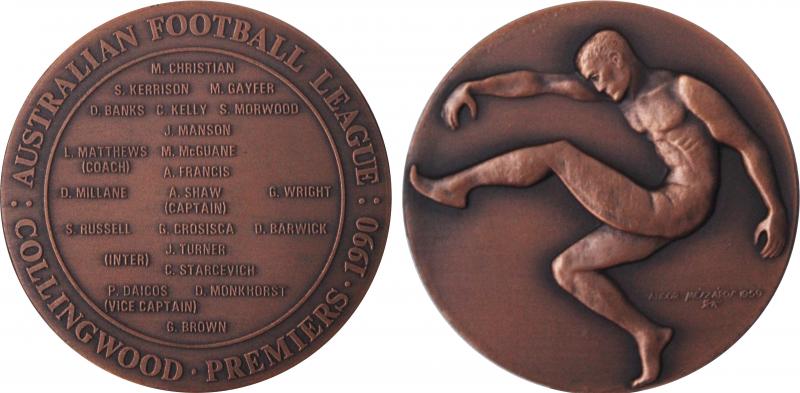 COLLINGWOOD: 1990 Premiership Medal, designed by Andor Meszaros, awarded to James Manson, window mounted with photograph of James