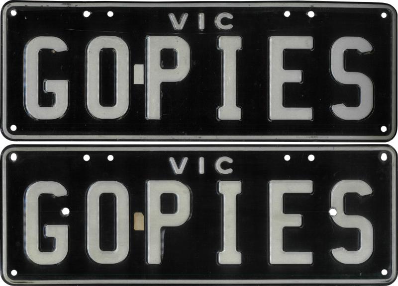 wear the “GO PIES” number plate on your motor vehicle. These are the ultimate number plates for the Collingwood Football Club. They have been held by the vendor for over 30 years and it is now time for a new custodian. (Image1) (Image2)
