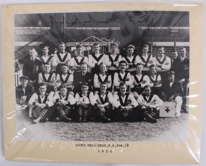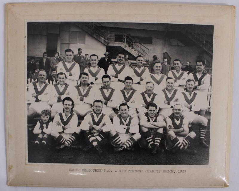 SOUTH MELBOURNE: Various team photos 1938, 1941, 1947, 1950 (2nd 18), 1957 (Old Timer's Charity Match), mounted on tin, each