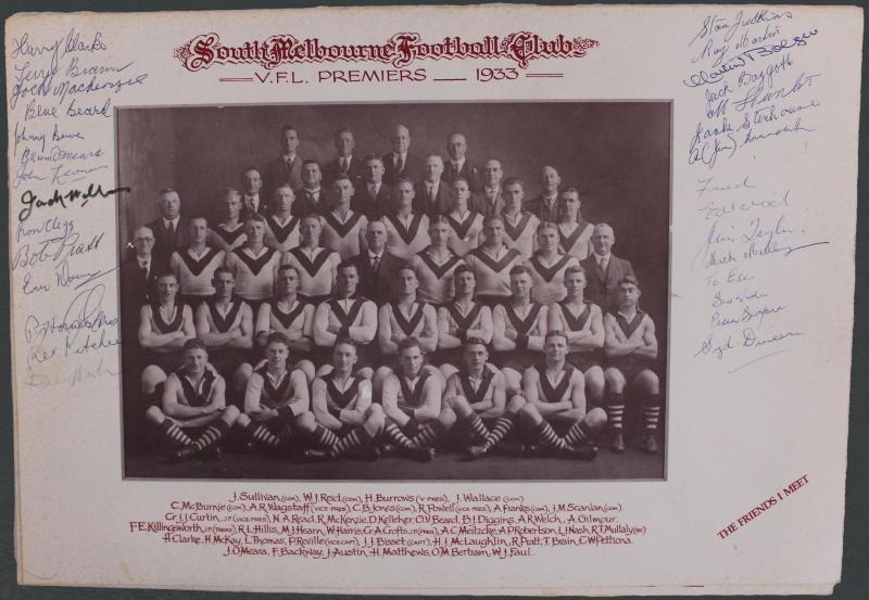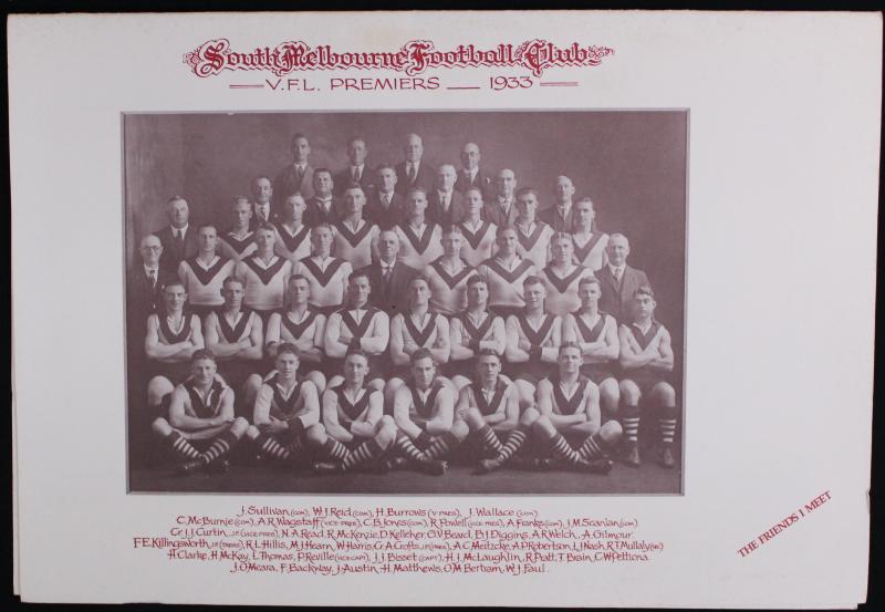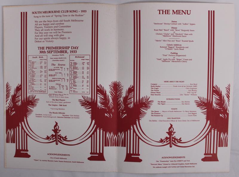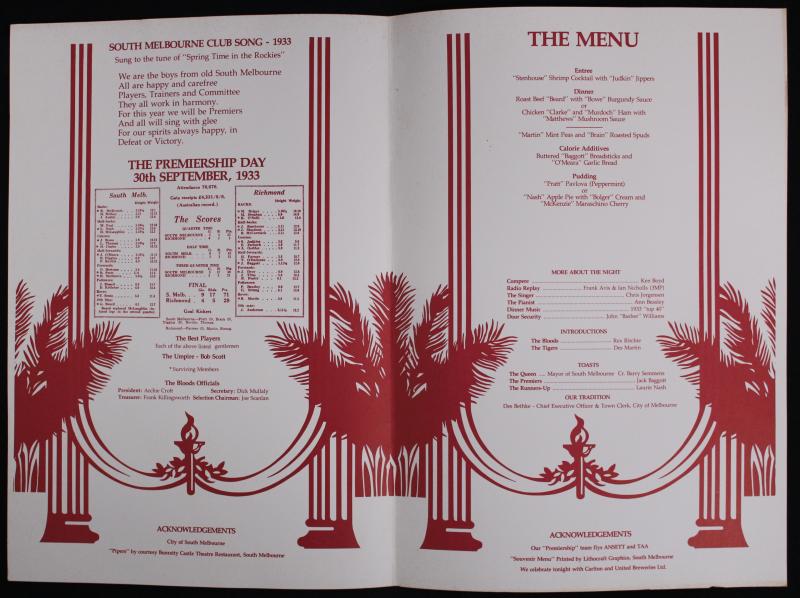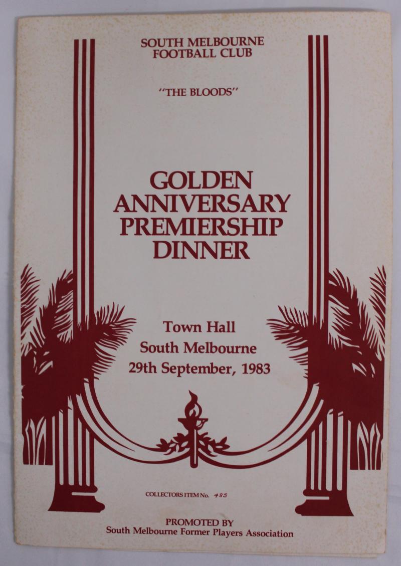 SOUTH MELBOURNE: Golden Anniversary Premiership Dinner program featuring 1933 VFL Premiership team photograph on reverse, and
