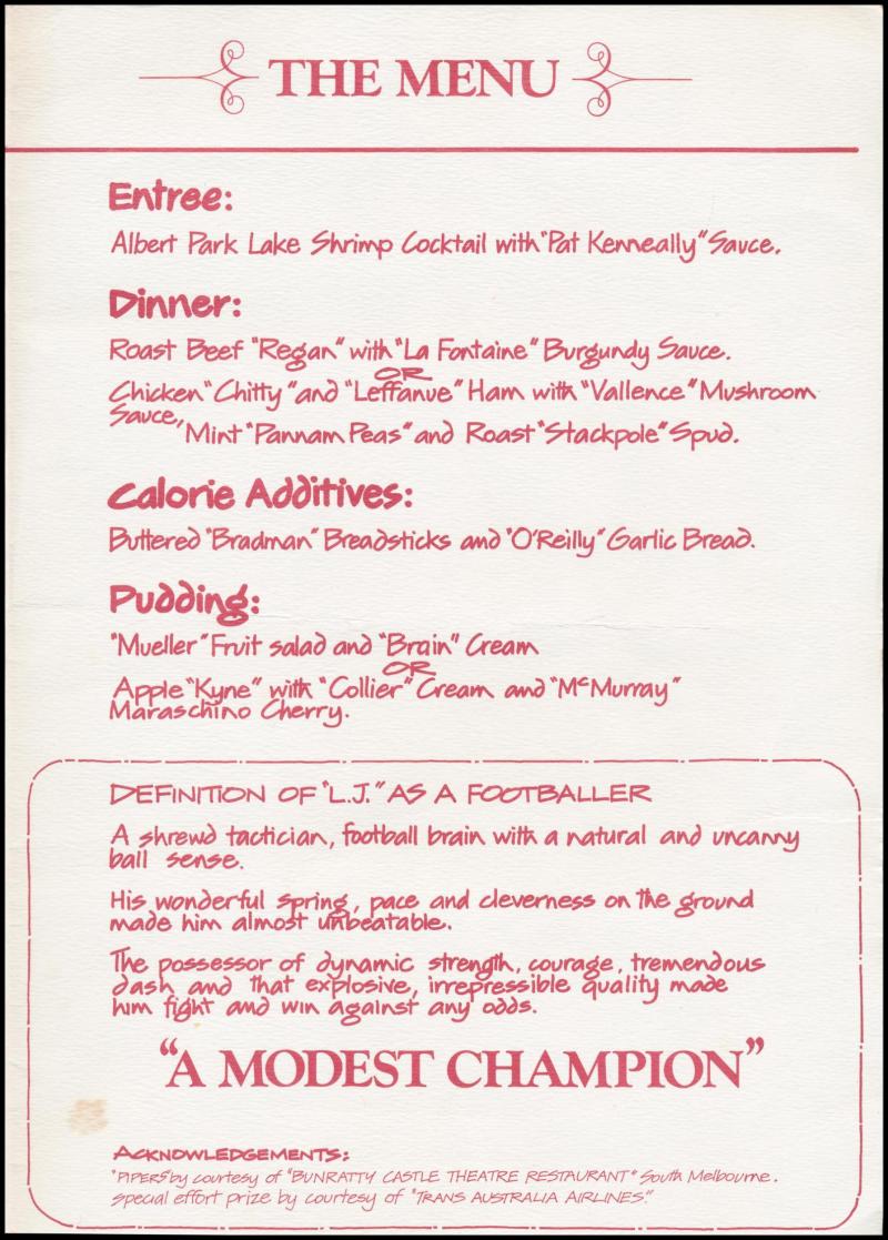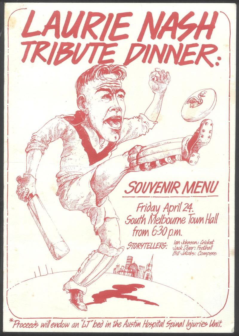 Laurie Nash Tribute Dinner Souvenir Menu with 6 signatures on reverse including Jim Dorgan, Stan Judkins and Clarke Shields (double century). Fine condition.
