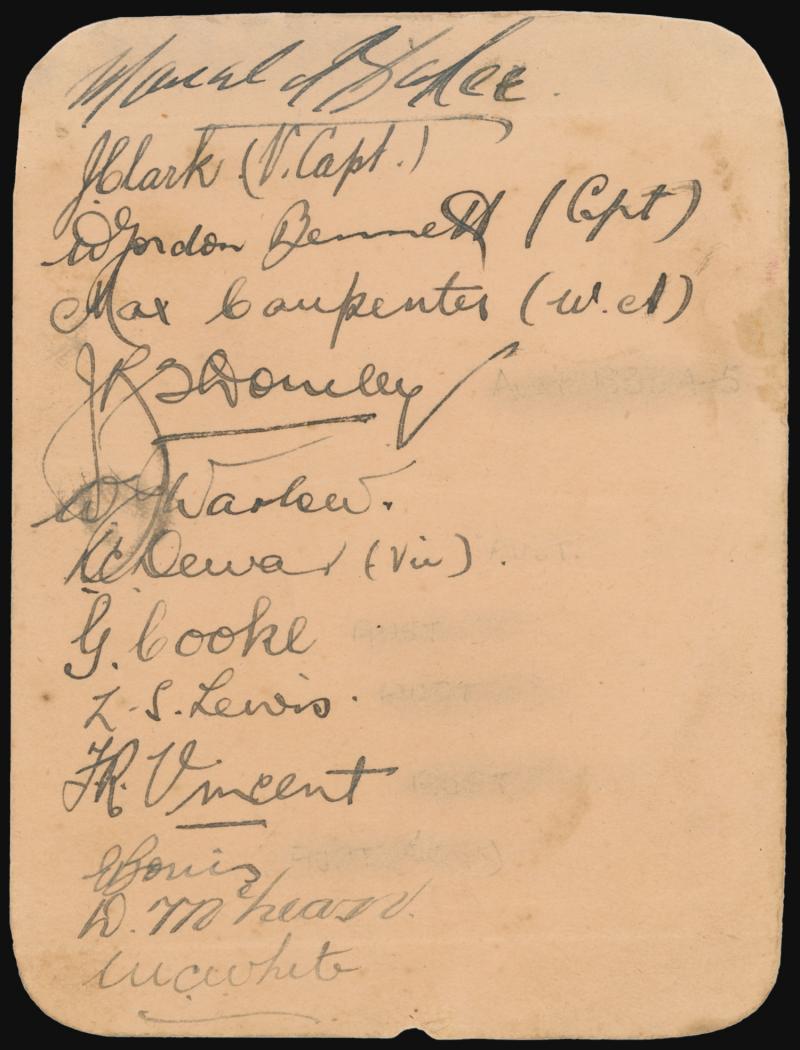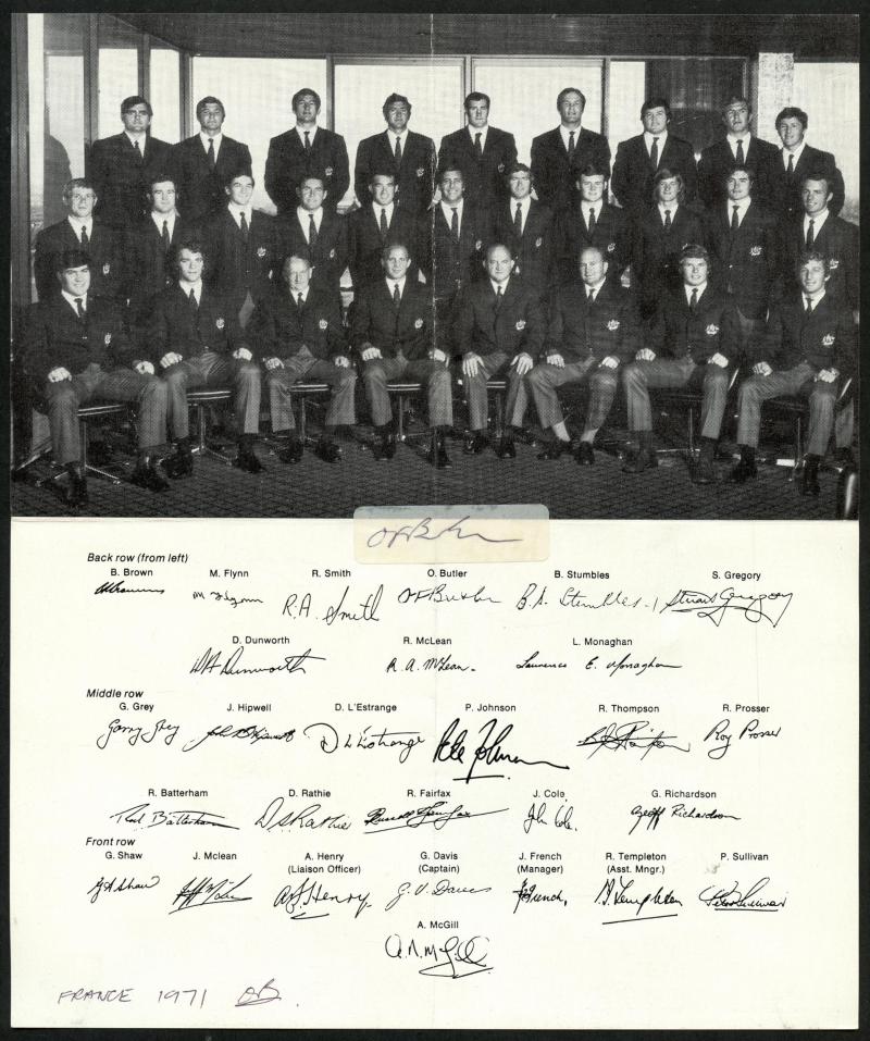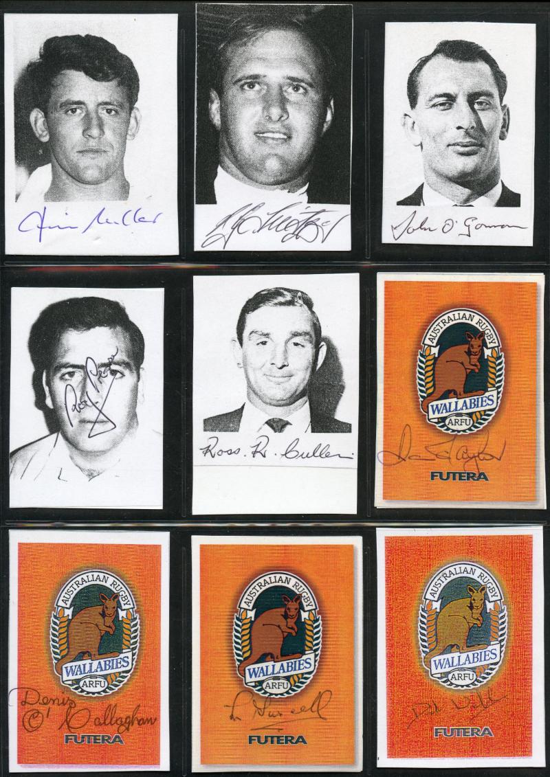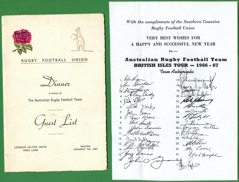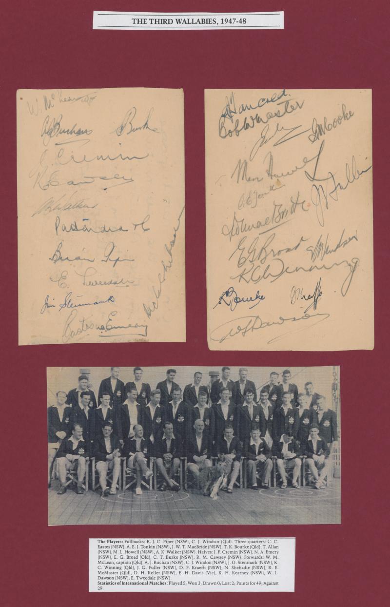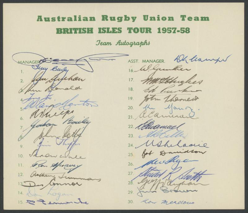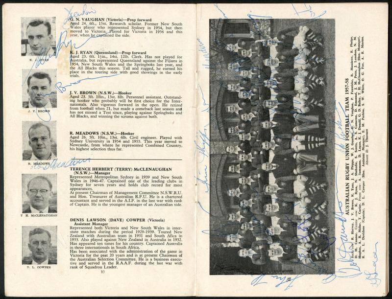 Premiers) with 18 signatures; 1947-48 Wallabies two autograph pages with 26 signatures; 1957-58 Wallabies team sheets (x2) each with 30 signatures; 1958 programme with 55 signatures; 1966-67 Wallabies dinner menu with 16 signatures; range of signed