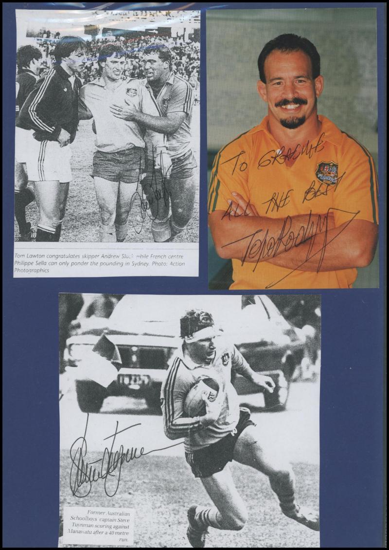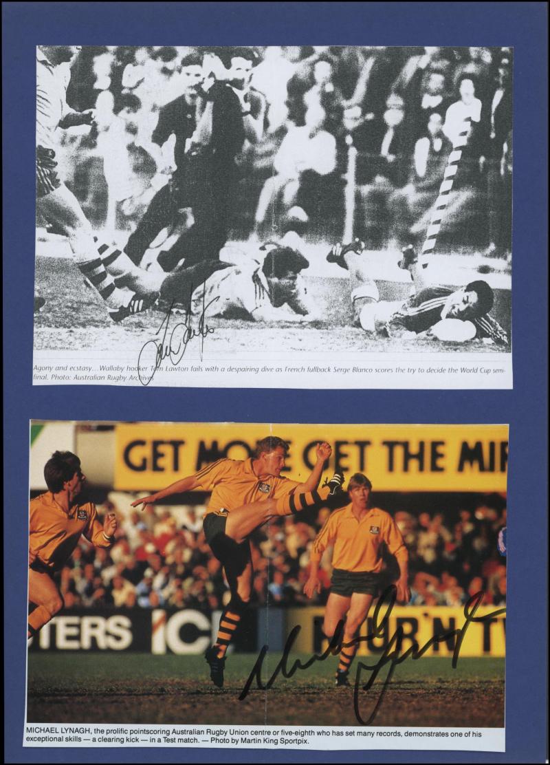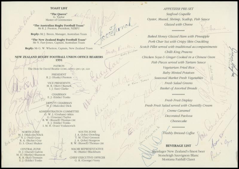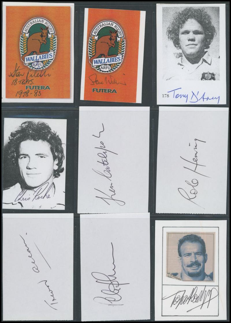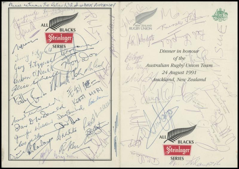 Autographs 1991 dinner menu signed by 79 Wallabies & All Blacks; signed Wallabies pictures & cards (31); plus unsigned Wallabies
