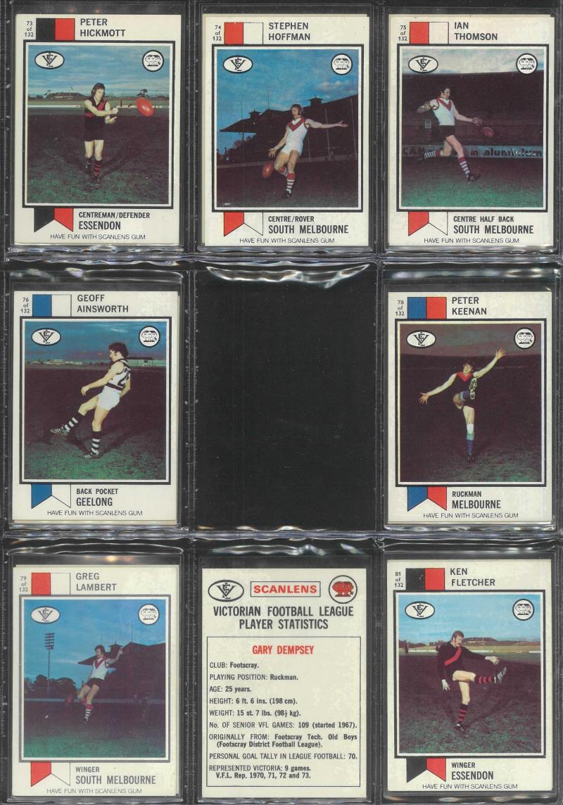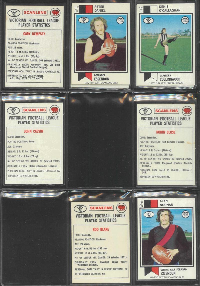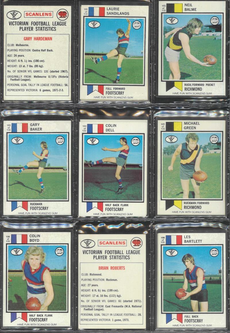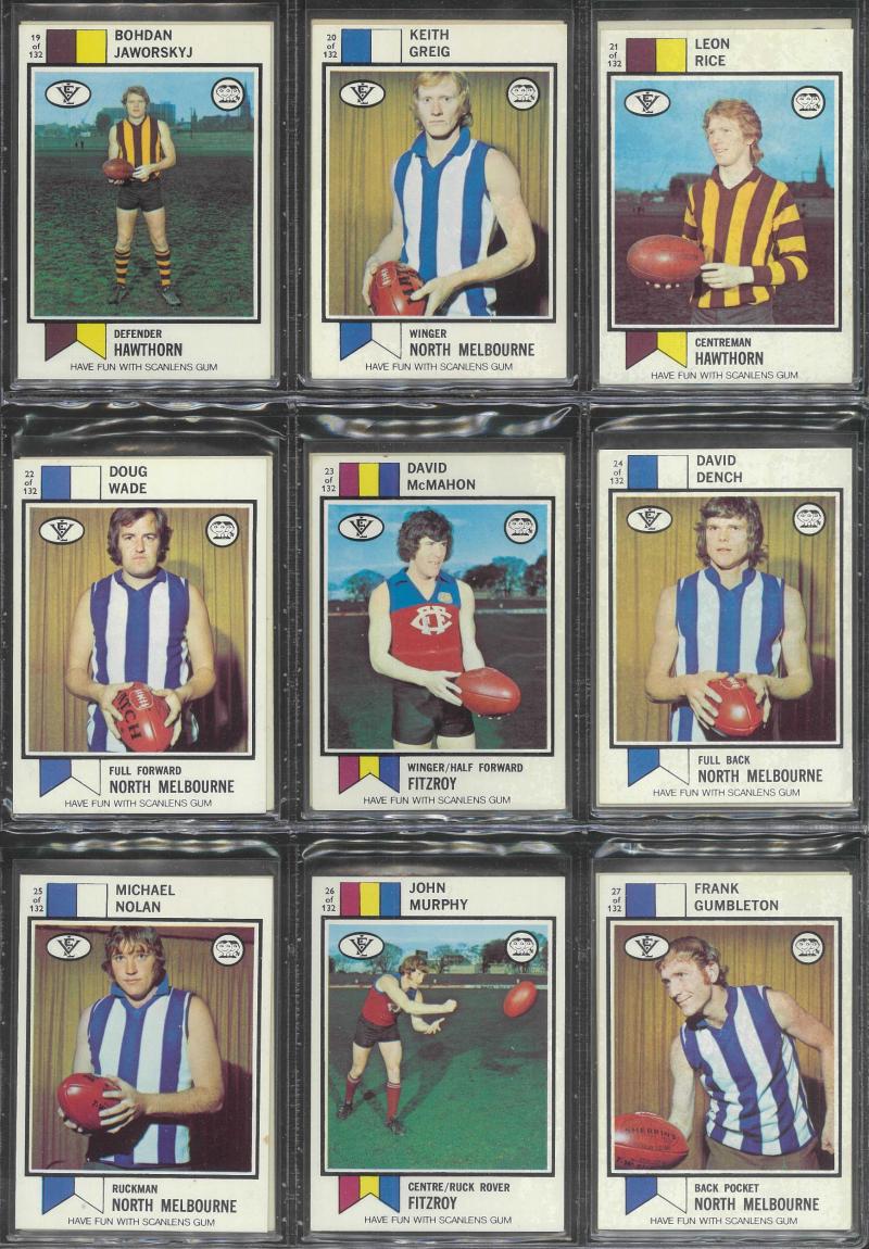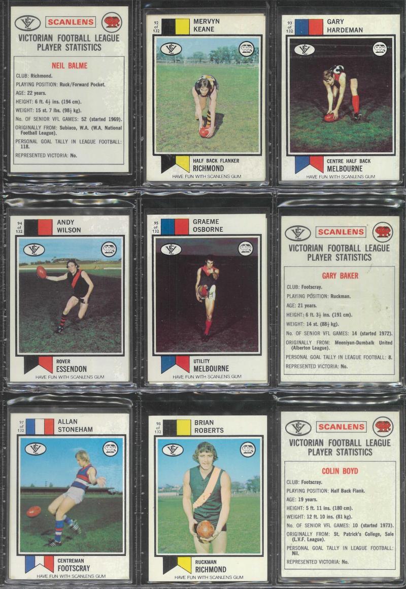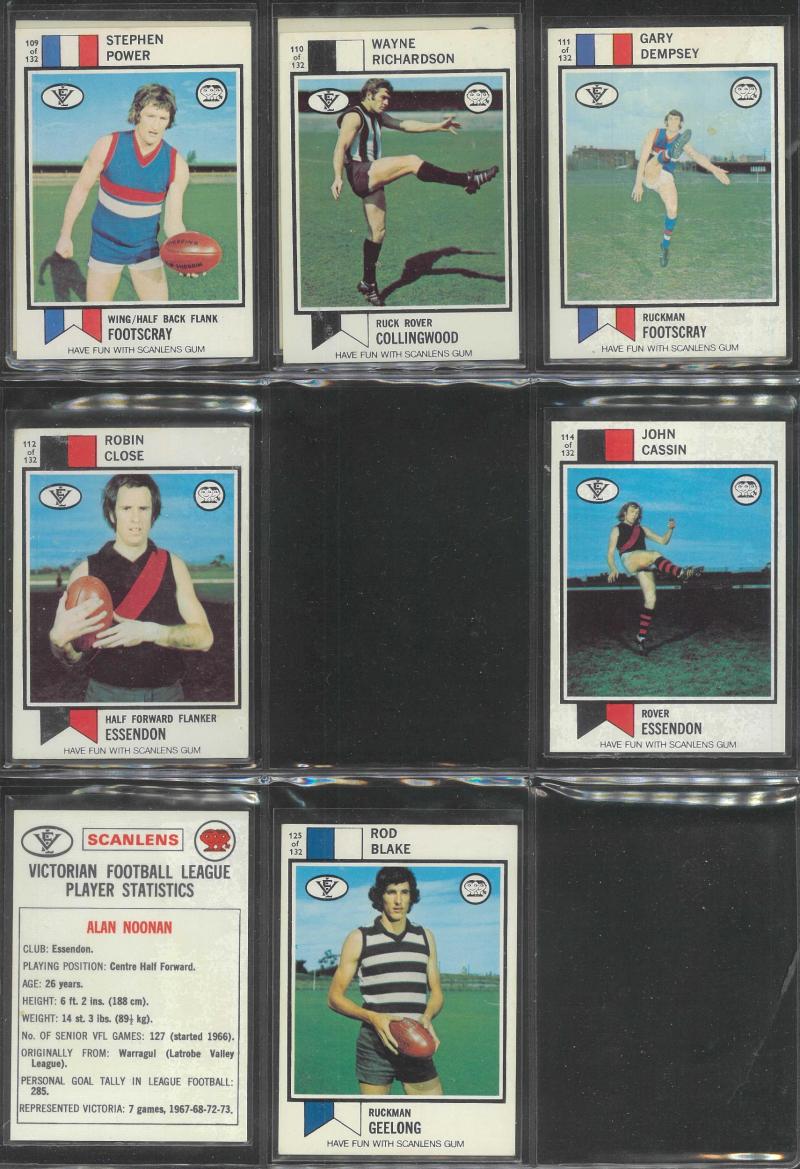 Essendon (10), Footscray (18), Geelong (1), Hawthorn (18) including rare Gary Ablett Sr Rookie card, Melbourne (19), North Melb (27), Richmond (1), South Melb (15) & StKilda (2), mainly Fine/Very Fine.