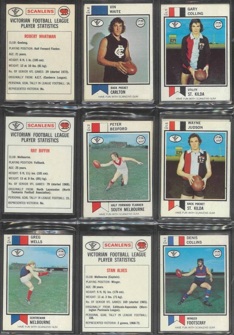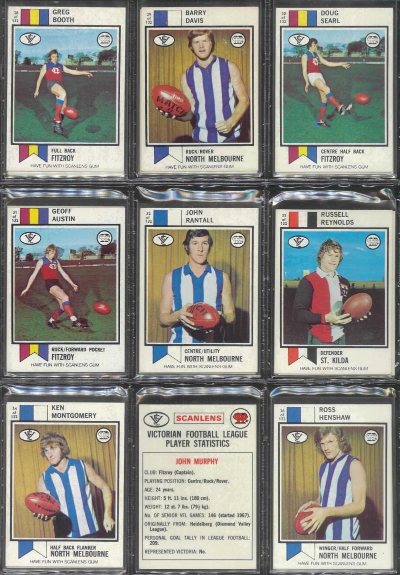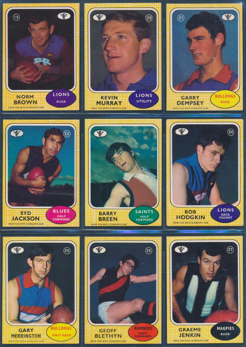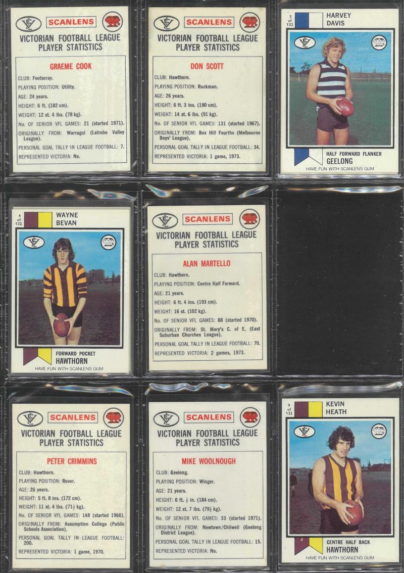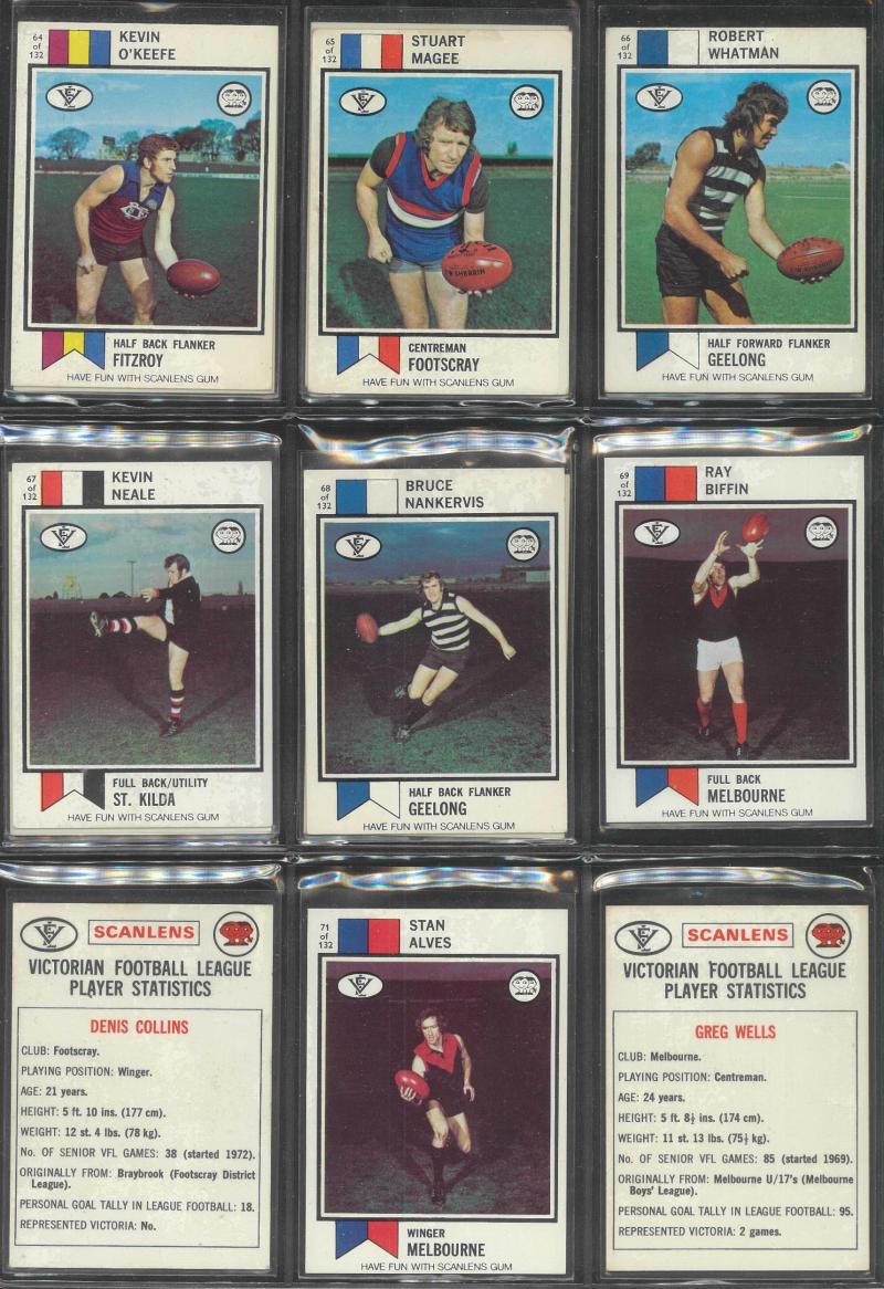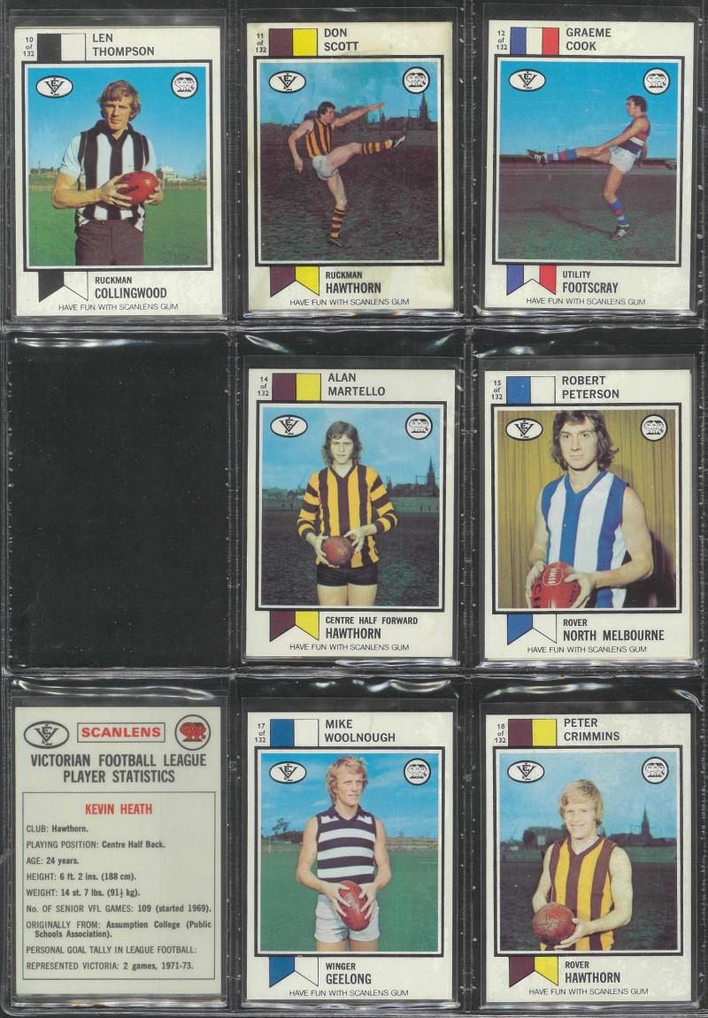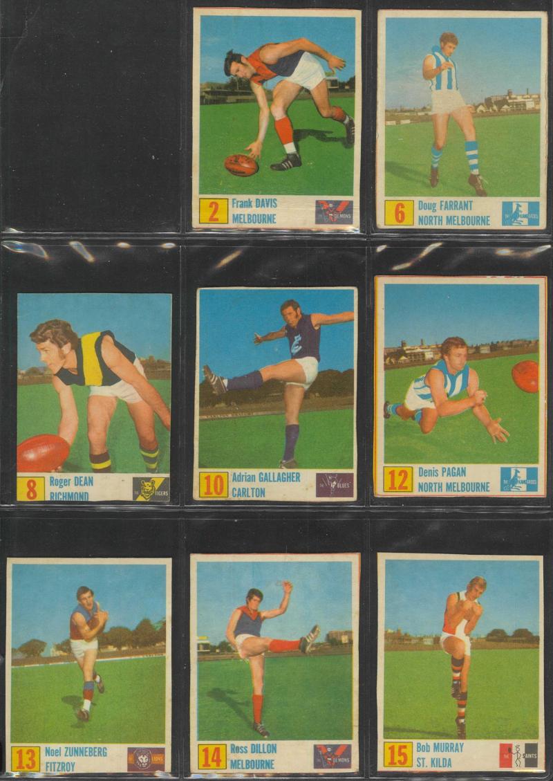 Essendon (10), Footscray (18), Geelong (1), Hawthorn (18) including rare Gary Ablett Sr Rookie card, Melbourne (19), North Melb (27), Richmond (1), South Melb (15) & StKilda (2), mainly Fine/Very Fine.